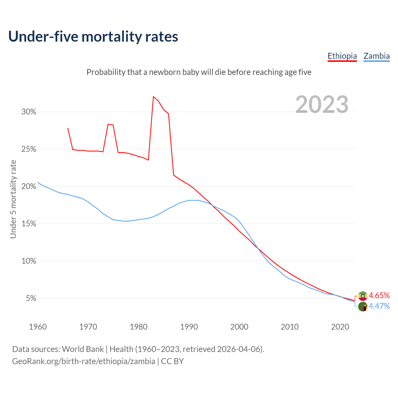 The chance that a newborn baby will die before reaching age five is 4.65% in Ethiopia and 4.47% in Zambia. Above is a chart with historical data on under-five mortality rates.