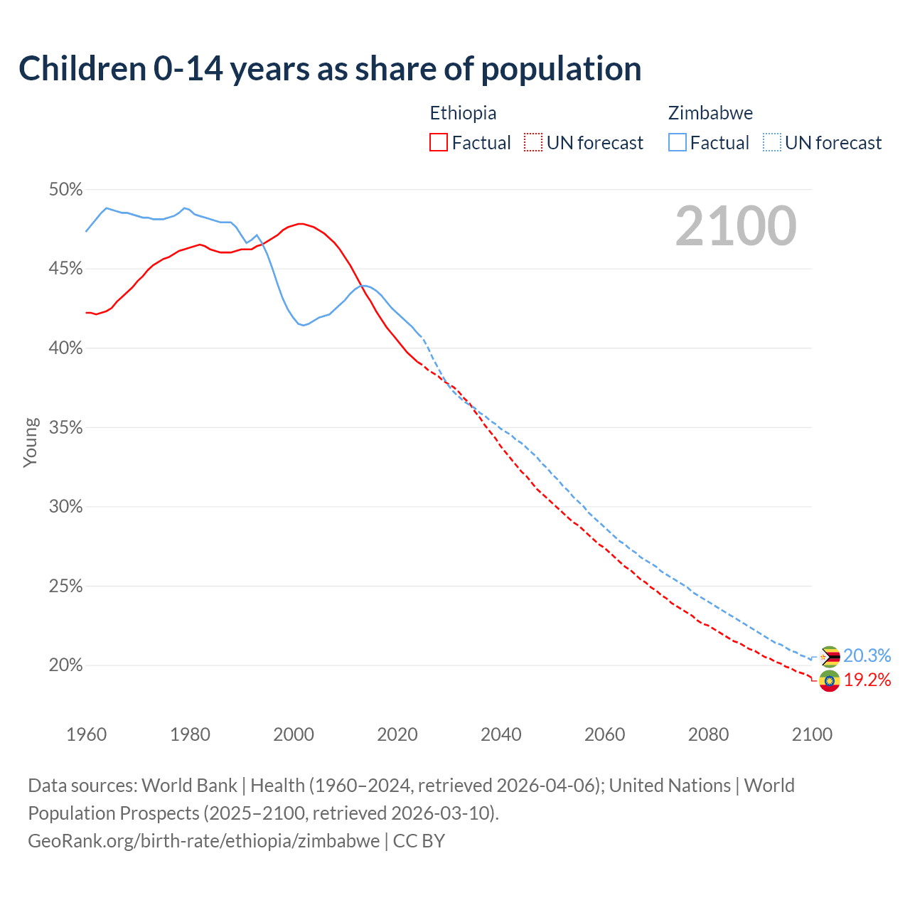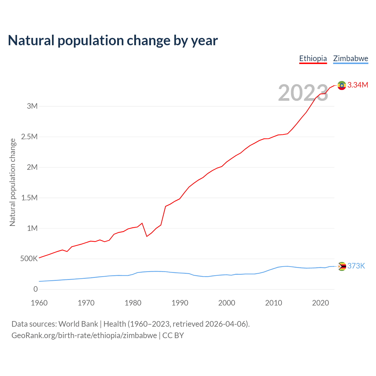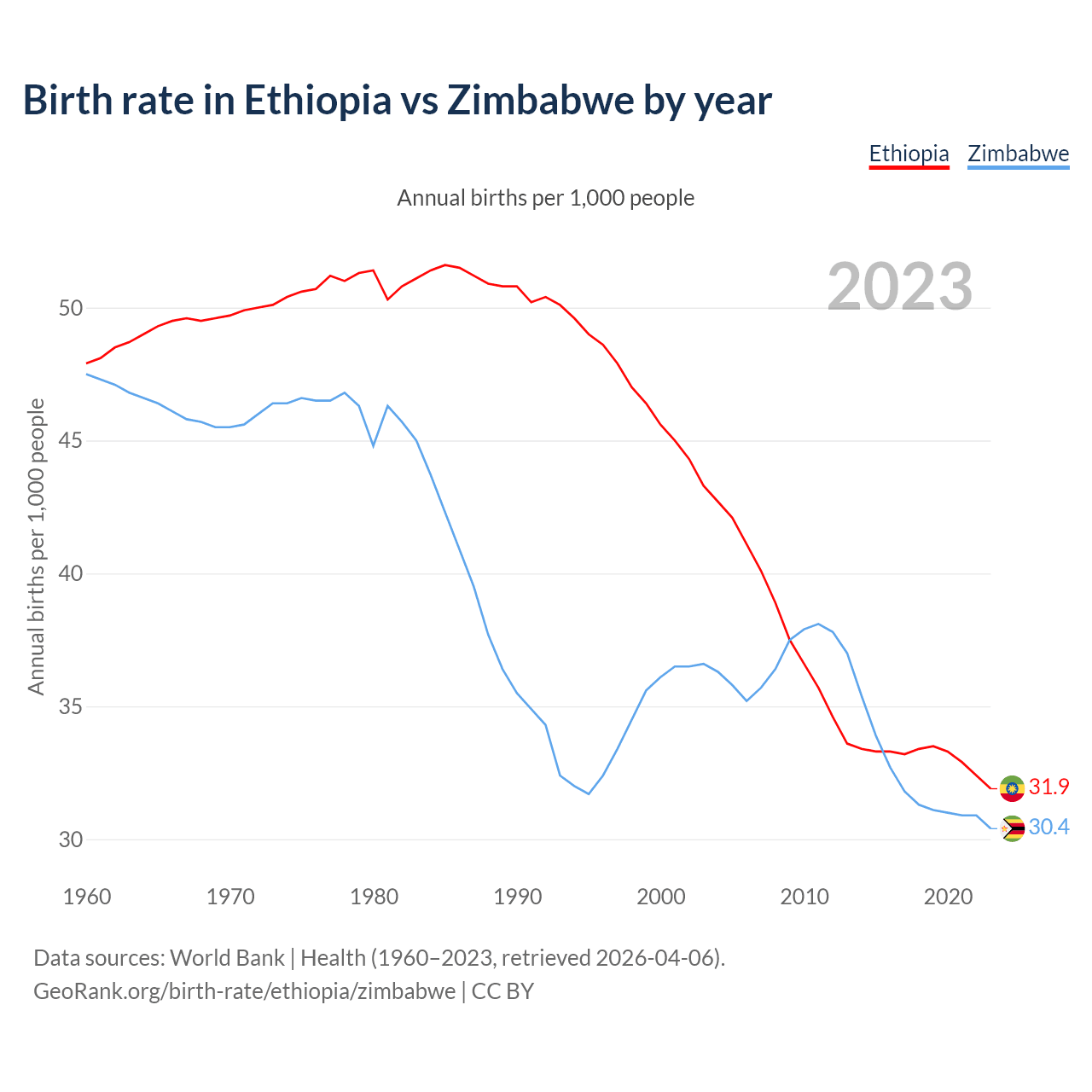 According to the latest available data on birth rates, the fertility rate in Ethiopia was 3.99 children per woman in 2023, compared to 3.72 in Zimbabwe in 2023. The replacement level is considered to be 2.1 children per woman.