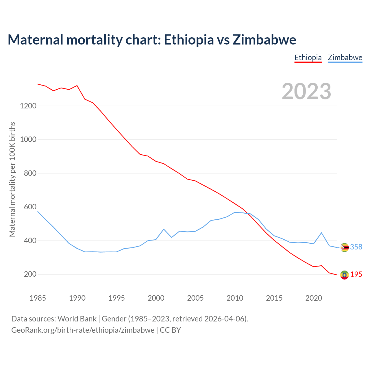The maternal mortality rate, which is the probability of dying during childbirth or within 42 days of pregnancy termination, is 195 deaths per 100,000 live births in Ethiopia, compared to 358 deaths in Zimbabwe.
