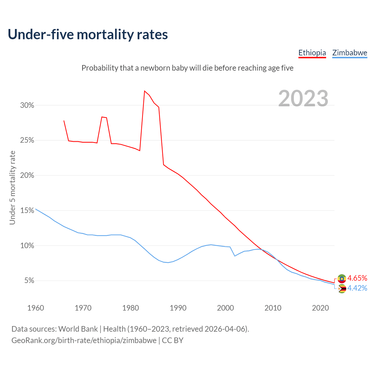 The chance that a newborn baby will die before reaching age five is 4.65% in Ethiopia and 4.42% in Zimbabwe. Above is a chart with historical data on under-five mortality rates.