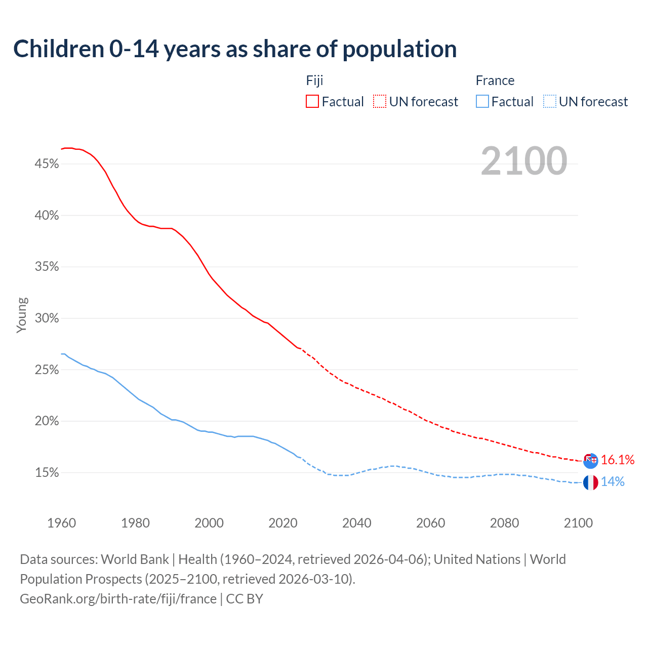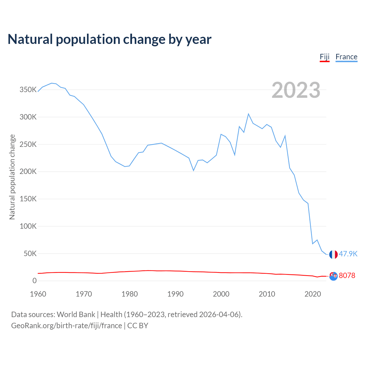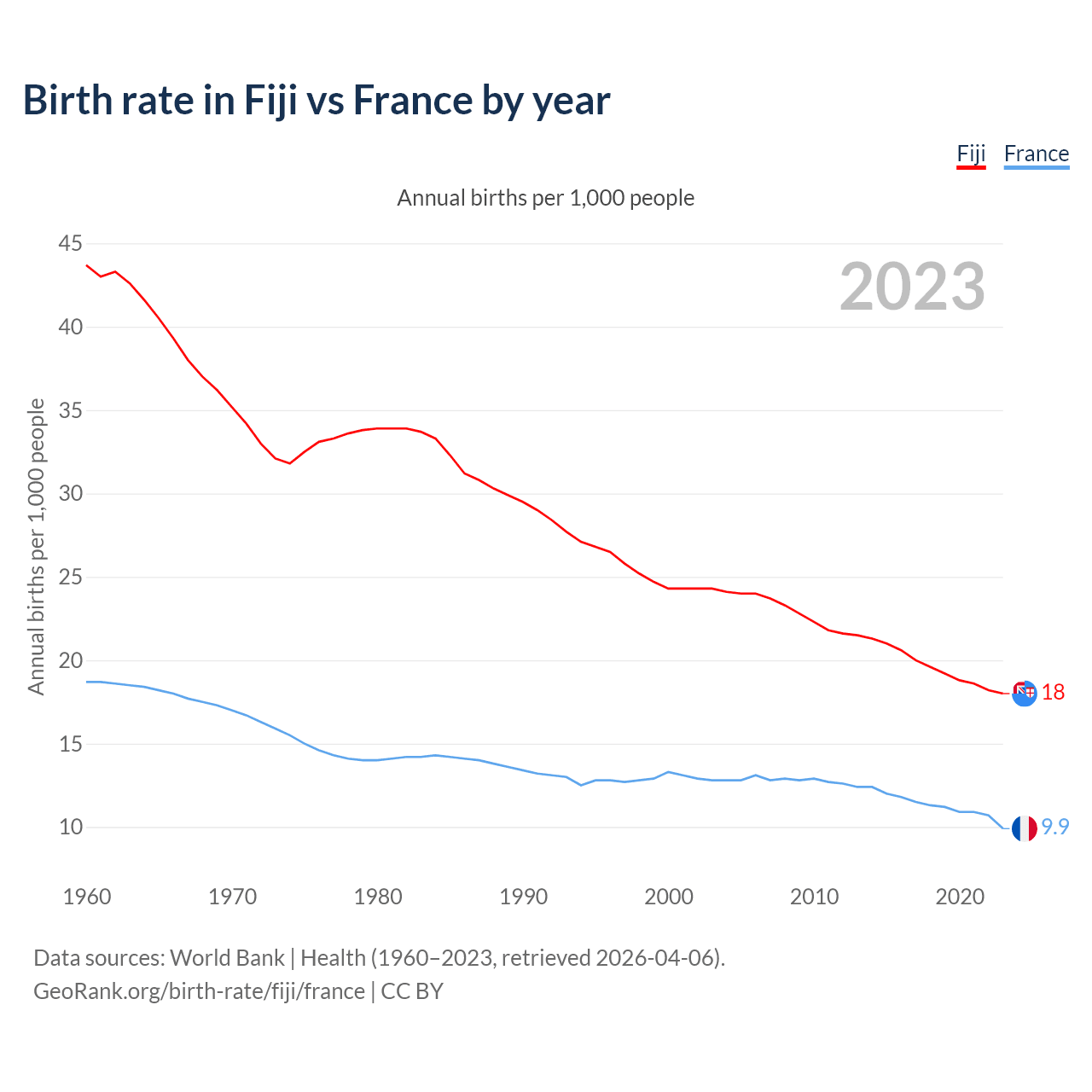 Fiji has an annual birth rate of 18 births per 1,000 people, compared to 9.9 for France. The average number of children a woman is expected to have during her lifetime — the fertility rate, is 2.28 in Fiji and 1.66 in France — 27.2% difference.
