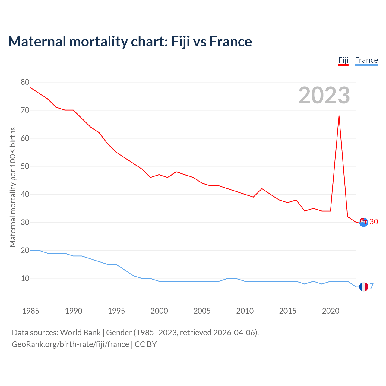 The maternal mortality rate, which is the probability of dying during childbirth or within 42 days of pregnancy termination, is 30 deaths per 100,000 live births in Fiji, compared to 7 deaths in France.