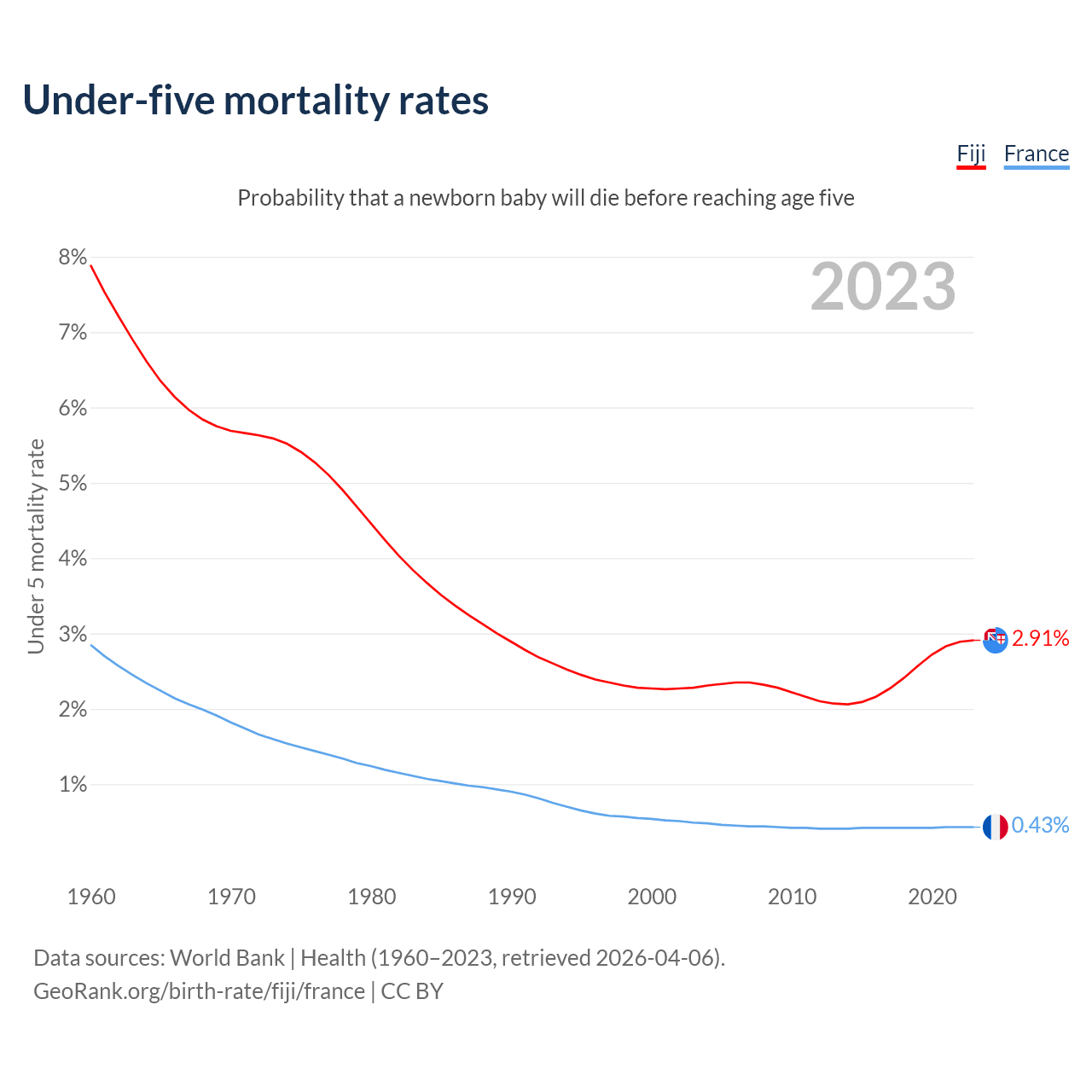 The chance that a newborn baby will die before reaching age five is 2.91% in Fiji and 0.43% in France. Above is a chart with historical data on under-five mortality rates.