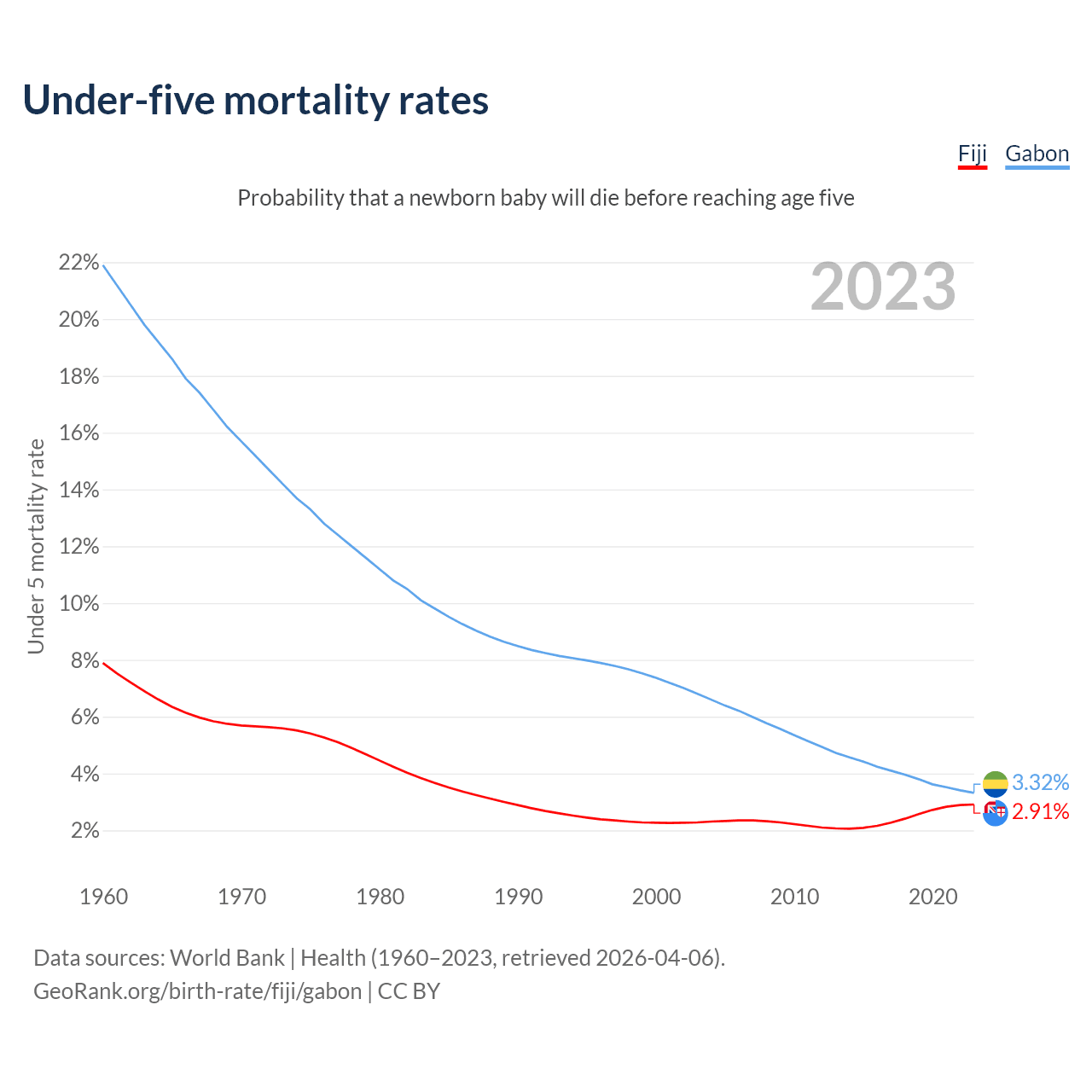 The chance that a newborn baby will die before reaching age five is 2.91% in Fiji and 3.32% in Gabon. Above is a chart with historical data on under-five mortality rates.