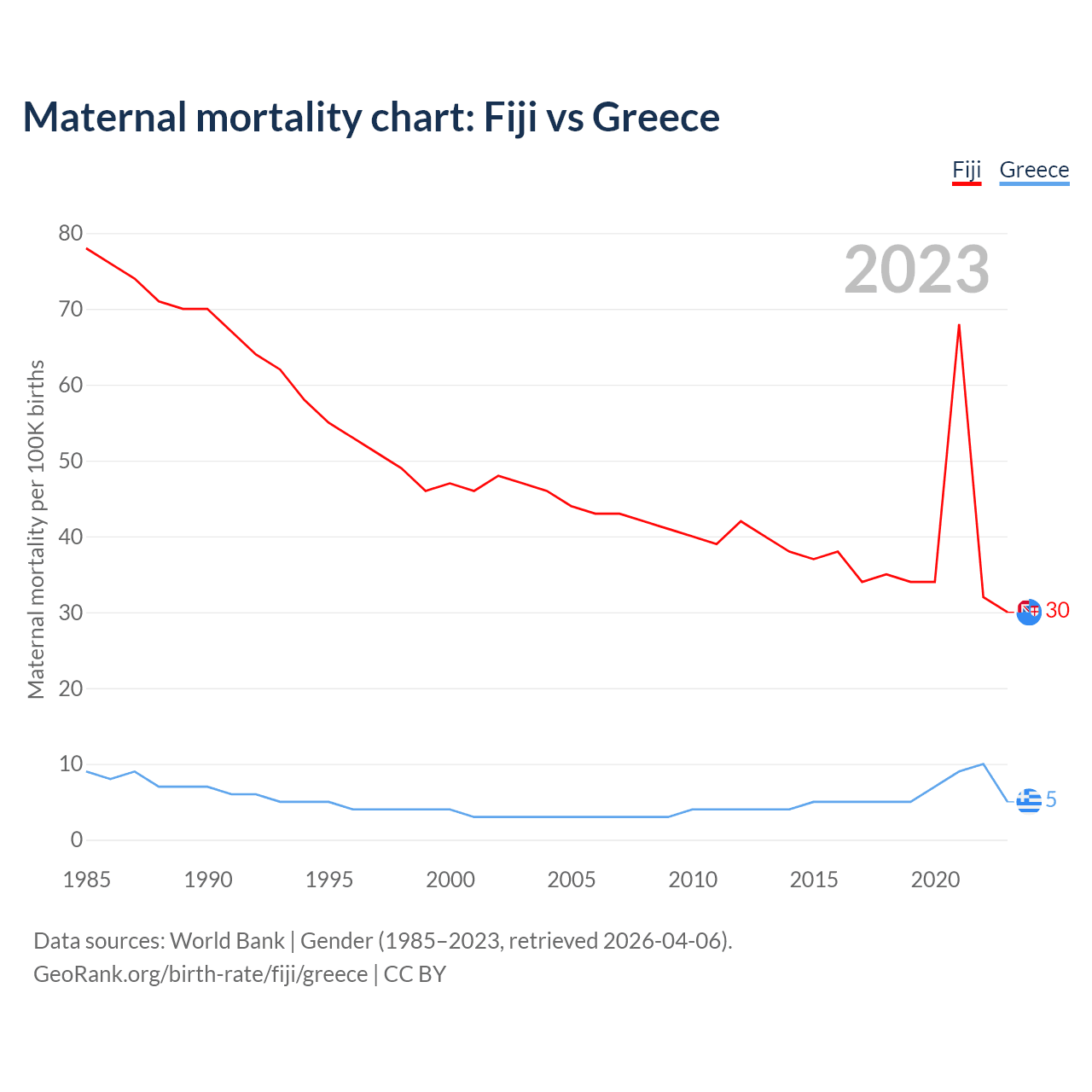 The maternal mortality rate, which is the probability of dying during childbirth or within 42 days of pregnancy termination, is 30 deaths per 100,000 live births in Fiji, compared to 5 deaths in Greece.