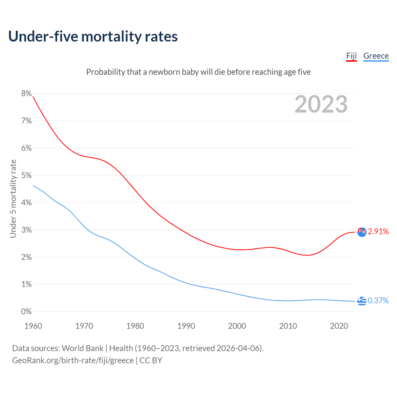 The chance that a newborn baby will die before reaching age five is 2.91% in Fiji and 0.37% in Greece. Above is a chart with historical data on under-five mortality rates.