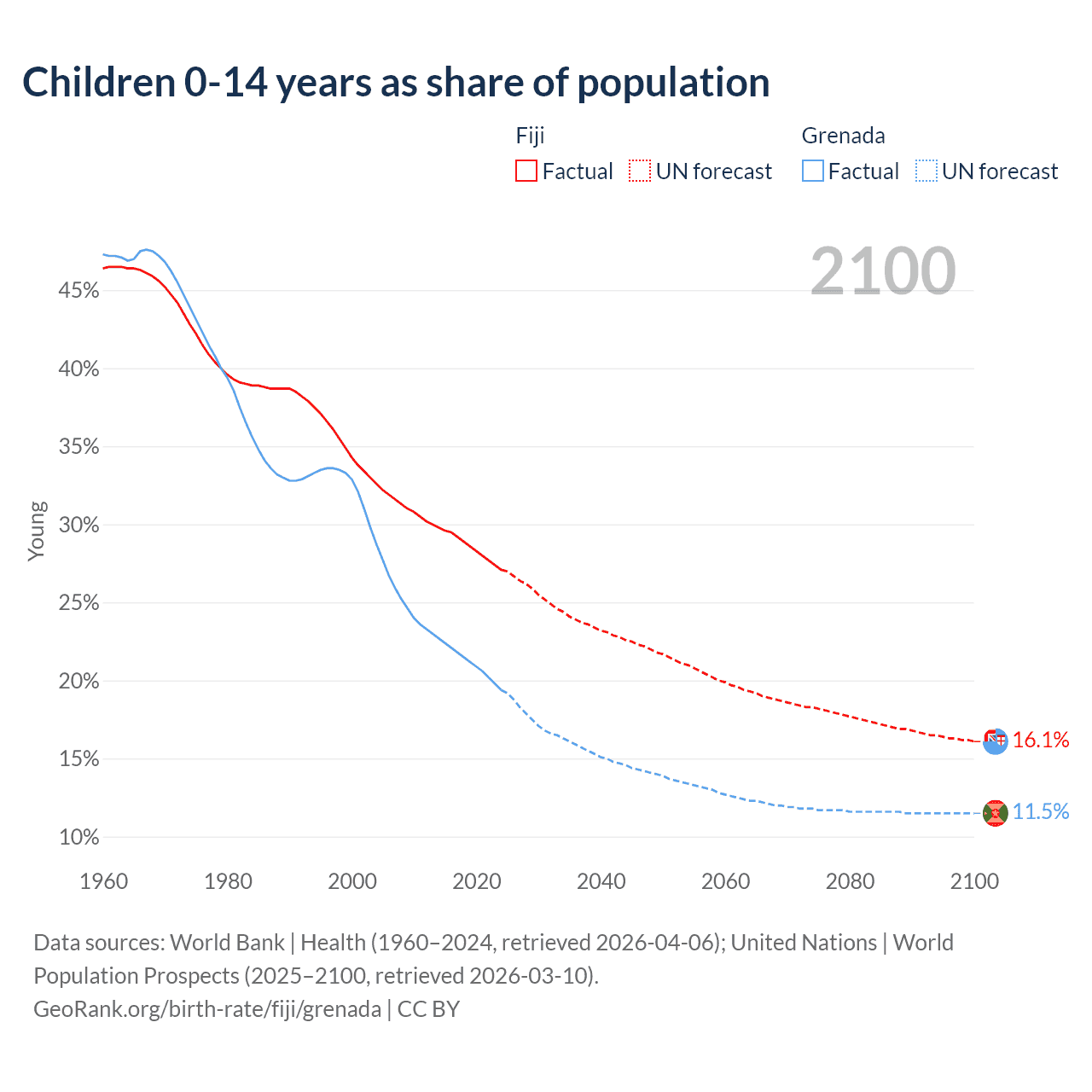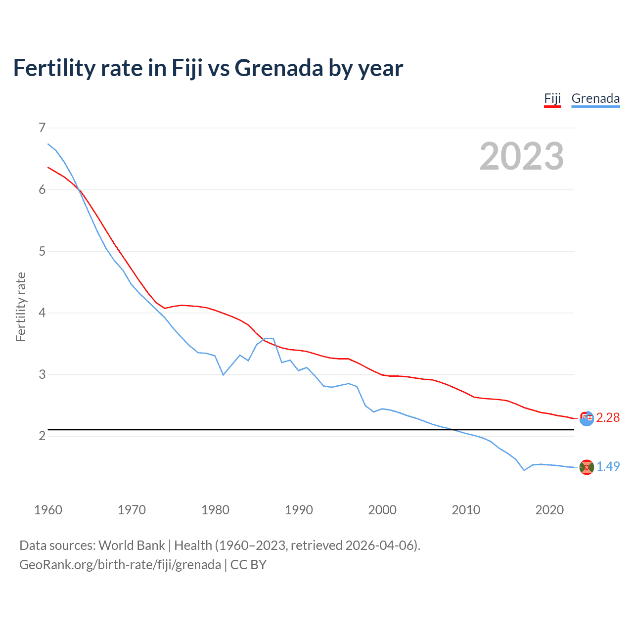 According to the latest available data on birth rates, the fertility rate in Fiji was 2.28 children per woman in 2023, compared to 1.49 in Grenada in 2023. The replacement level is considered to be 2.1 children per woman.