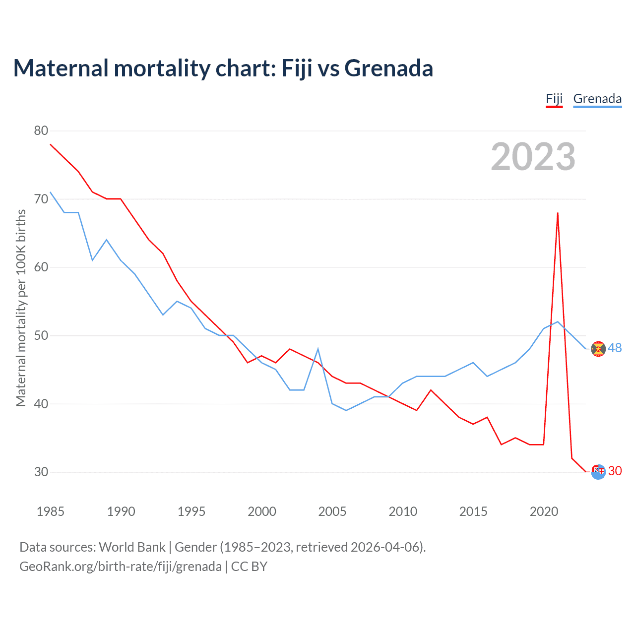 The maternal mortality rate, which is the probability of dying during childbirth or within 42 days of pregnancy termination, is 30 deaths per 100,000 live births in Fiji, compared to 48 deaths in Grenada.