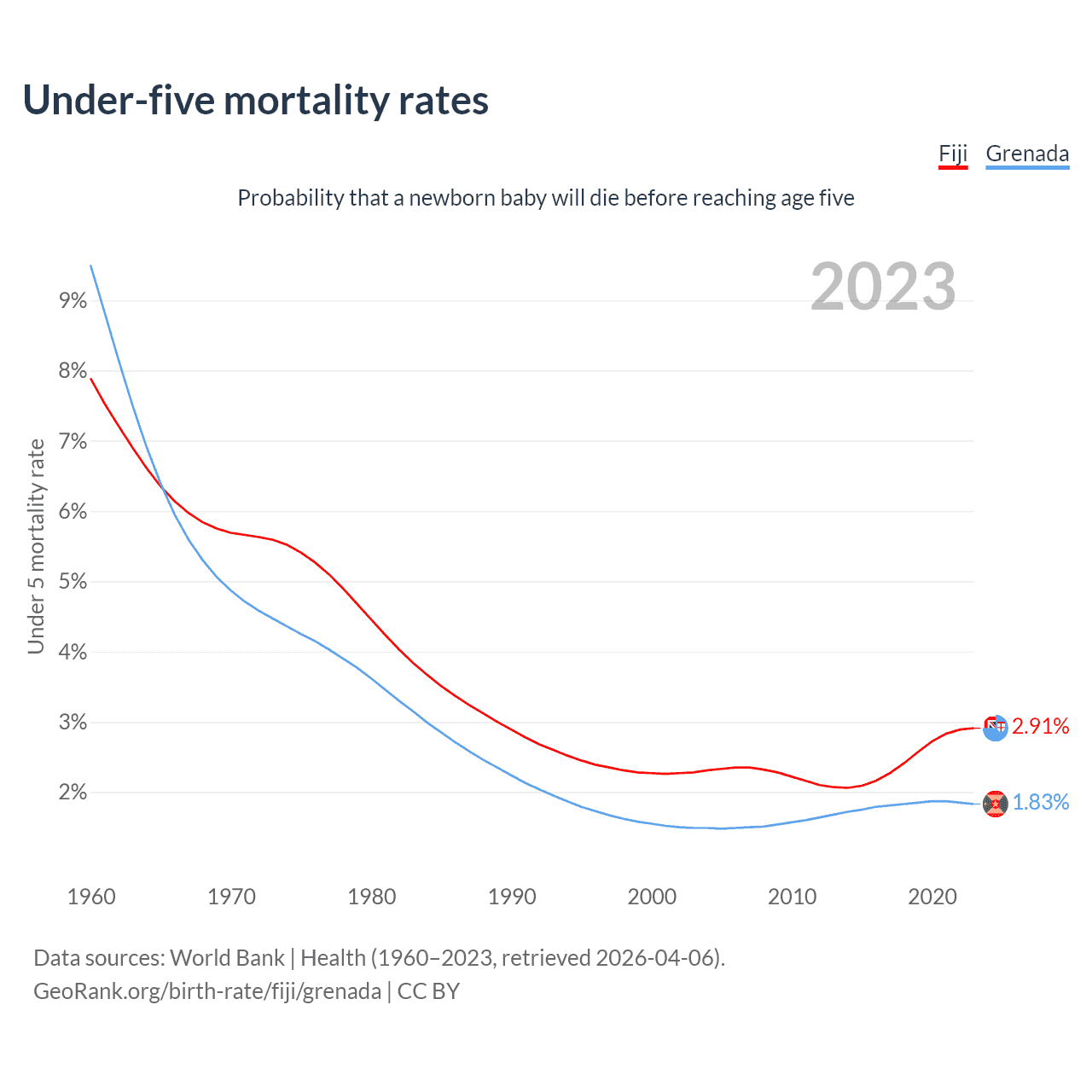 The chance that a newborn baby will die before reaching age five is 2.91% in Fiji and 1.83% in Grenada. Above is a chart with historical data on under-five mortality rates.
