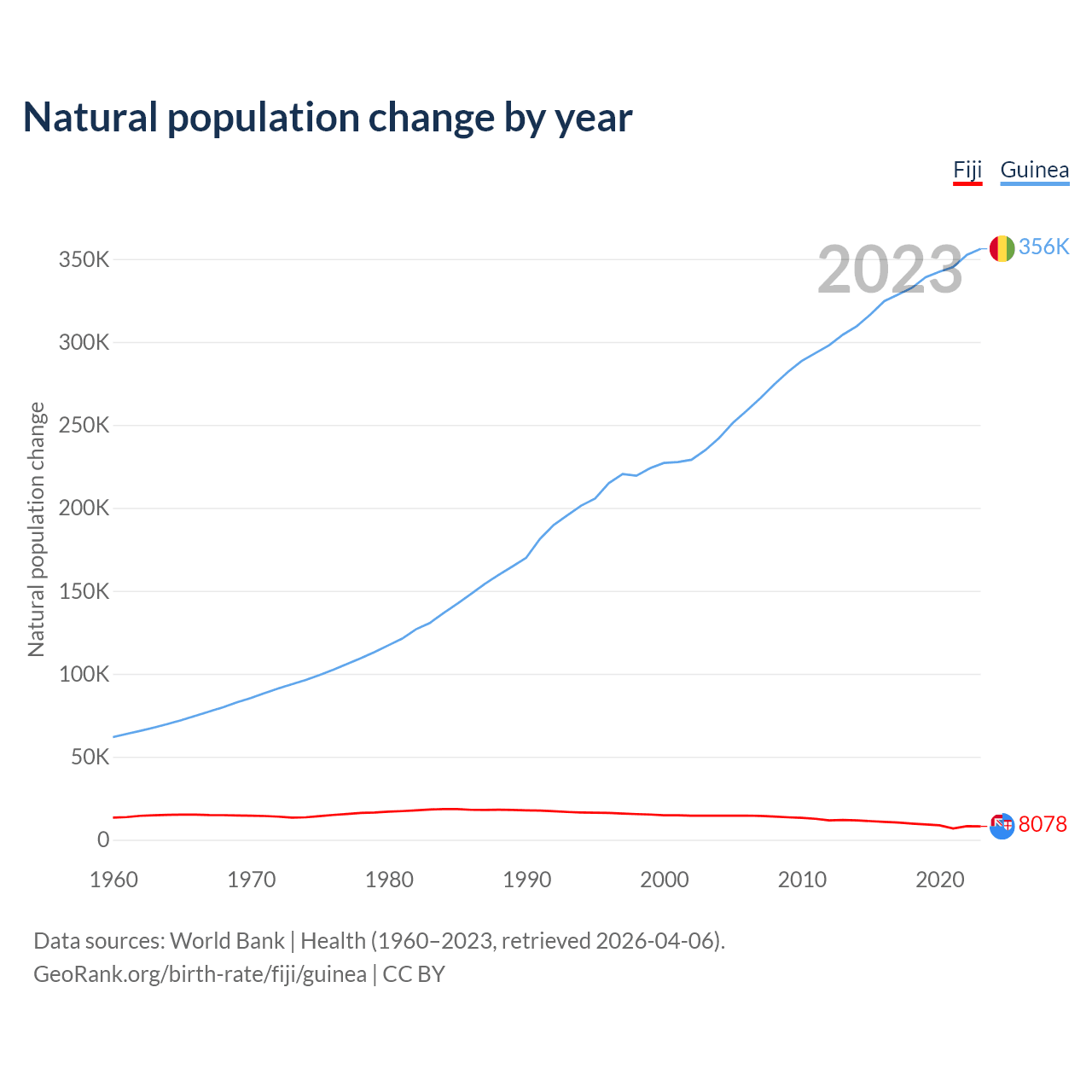 Fiji has an annual birth rate of 18 births per 1,000 people, compared to 33.8 for Guinea. The average number of children a woman is expected to have during her lifetime — the fertility rate, is 2.28 in Fiji and 4.22 in Guinea — 84.9% difference.