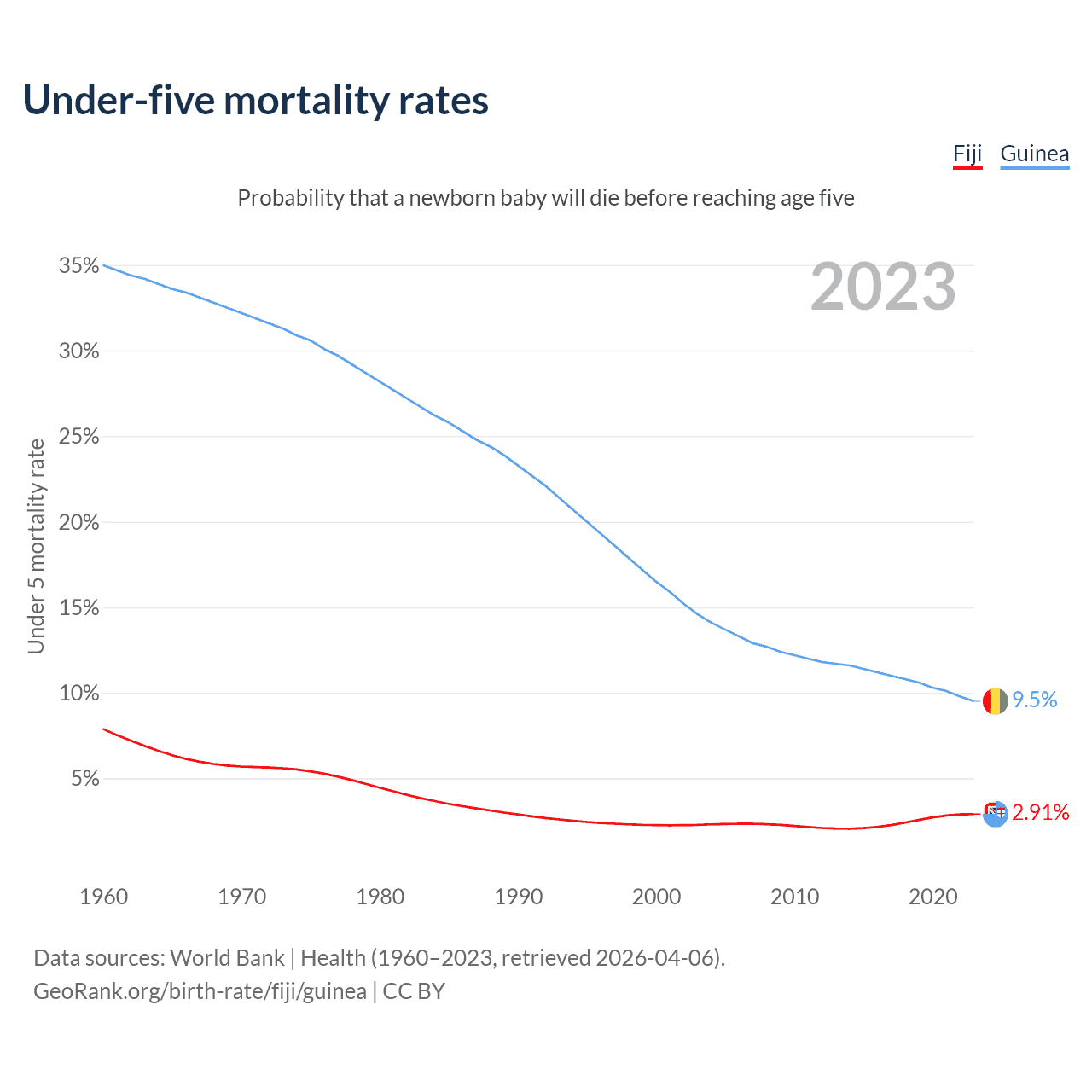The chance that a newborn baby will die before reaching age five is 2.91% in Fiji and 9.5% in Guinea. Above is a chart with historical data on under-five mortality rates.