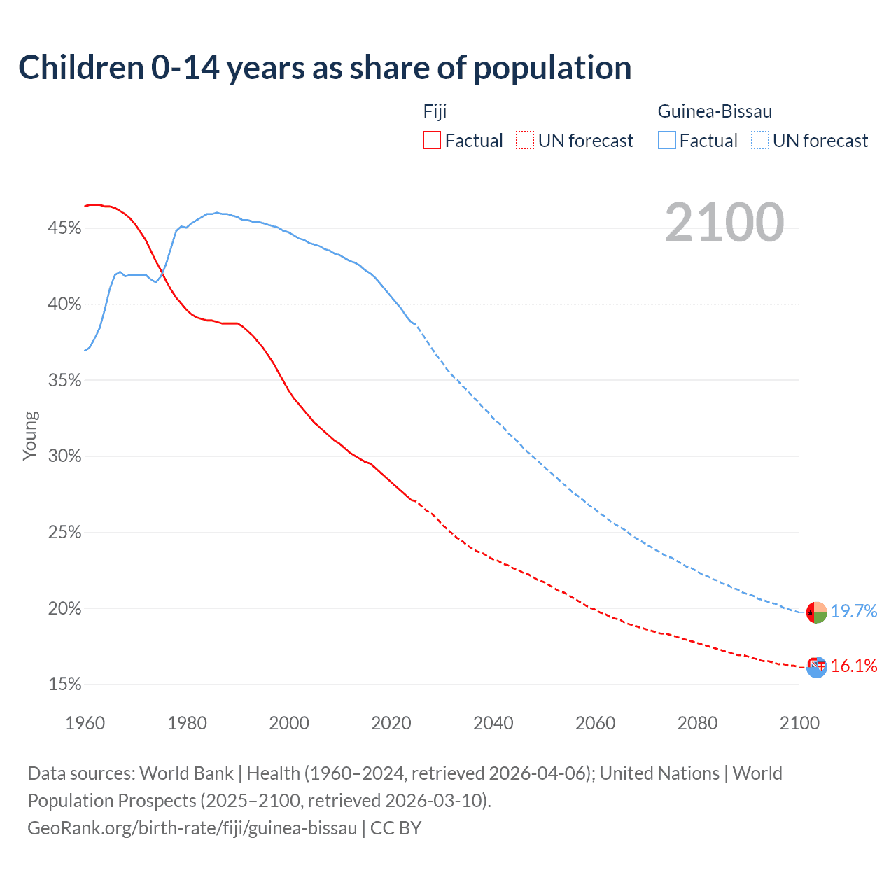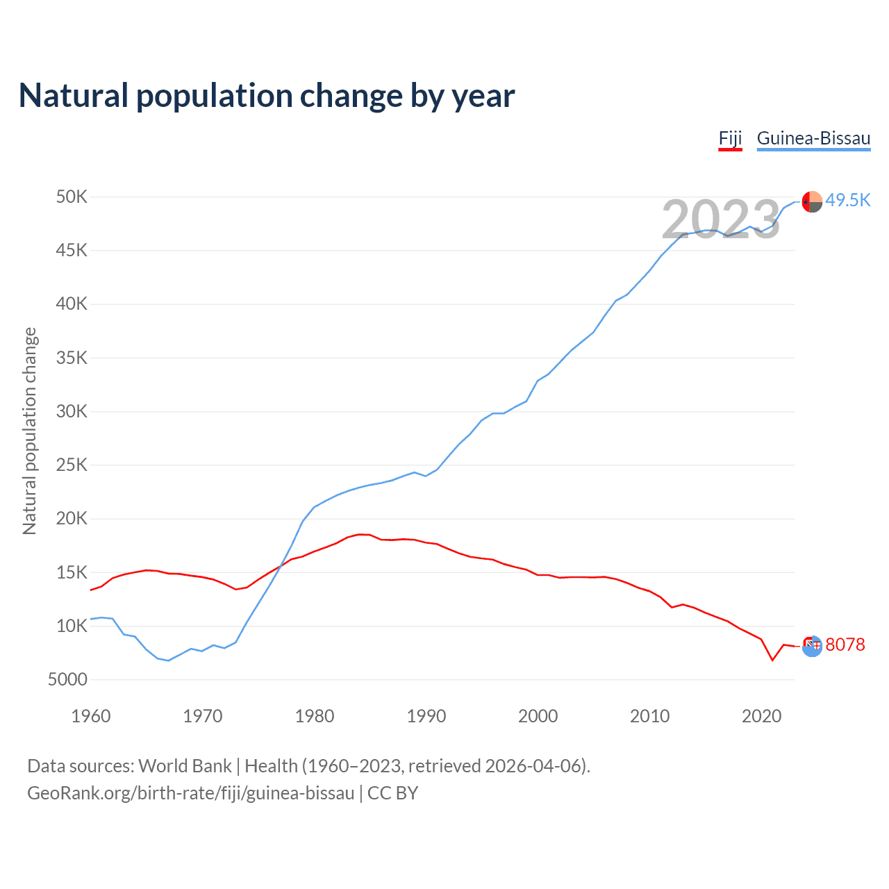 Fiji has an annual birth rate of 18 births per 1,000 people, compared to 30 for Guinea-Bissau. The average number of children a woman is expected to have during her lifetime — the fertility rate, is 2.28 in Fiji and 3.84 in Guinea-Bissau — 68.2% difference.