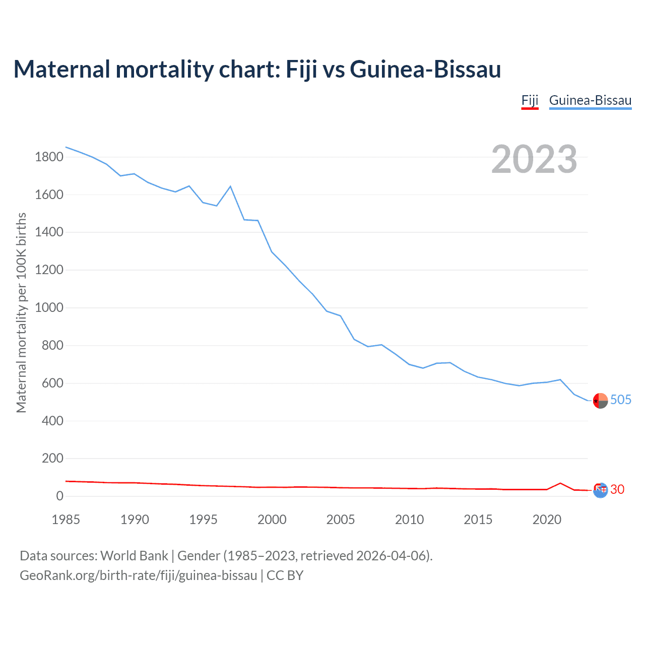 The maternal mortality rate, which is the probability of dying during childbirth or within 42 days of pregnancy termination, is 30 deaths per 100,000 live births in Fiji, compared to 505 deaths in Guinea-Bissau.
