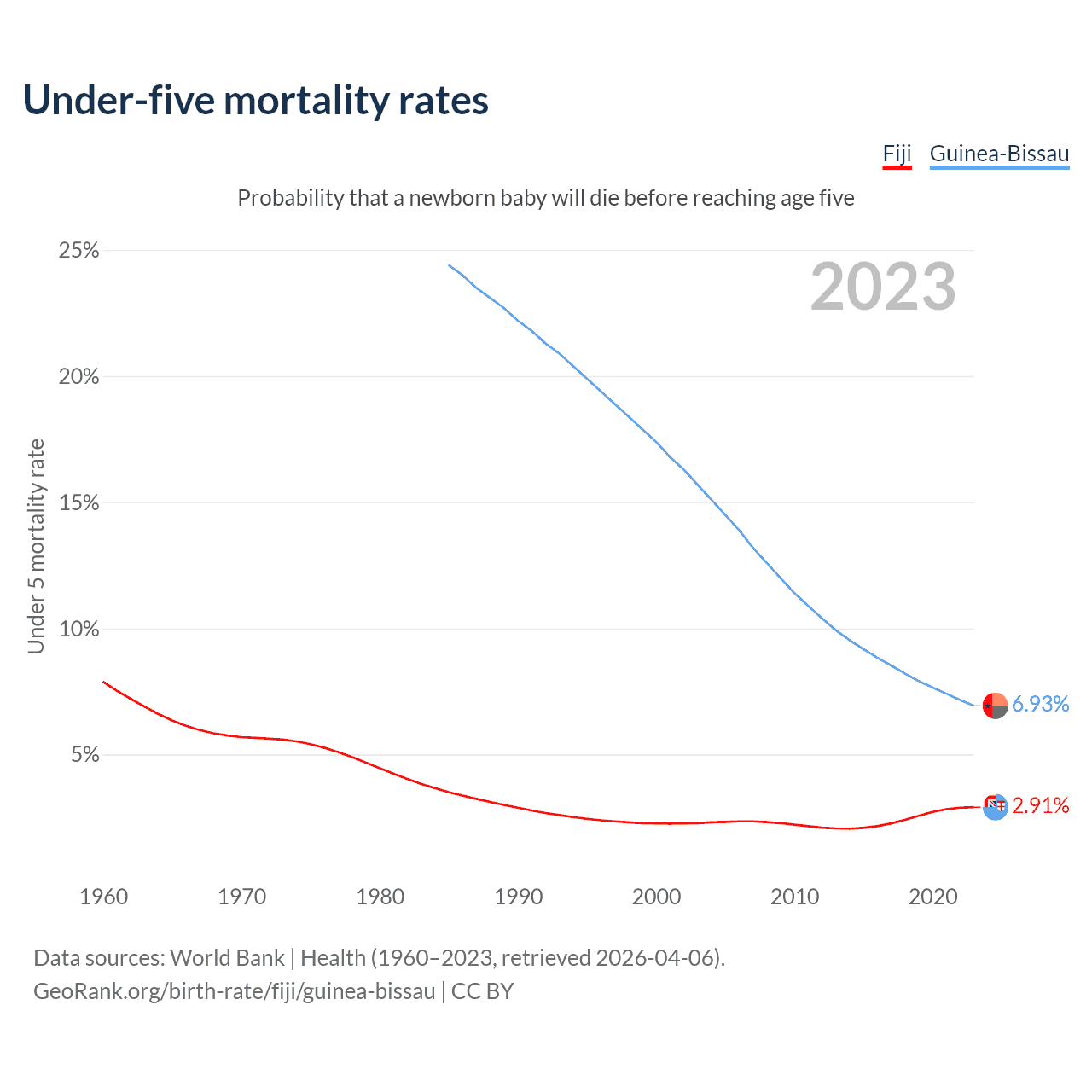 The chance that a newborn baby will die before reaching age five is 2.91% in Fiji and 6.93% in Guinea-Bissau. Above is a chart with historical data on under-five mortality rates.