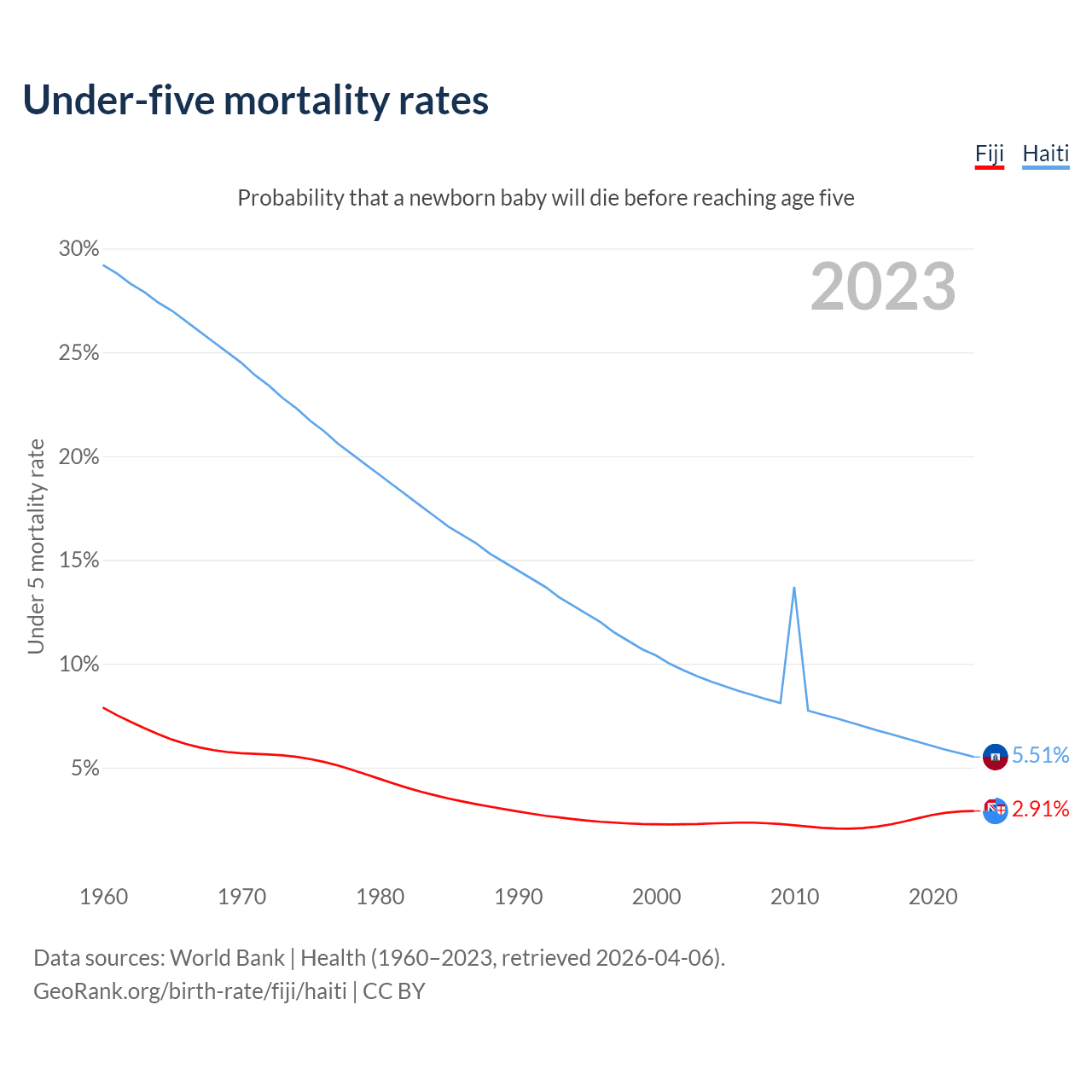 The chance that a newborn baby will die before reaching age five is 2.91% in Fiji and 5.51% in Haiti. Above is a chart with historical data on under-five mortality rates.