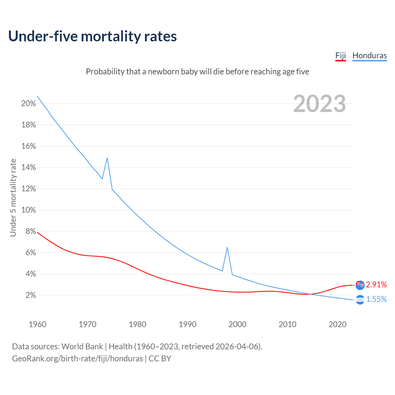 The chance that a newborn baby will die before reaching age five is 2.91% in Fiji and 1.55% in Honduras. Above is a chart with historical data on under-five mortality rates.