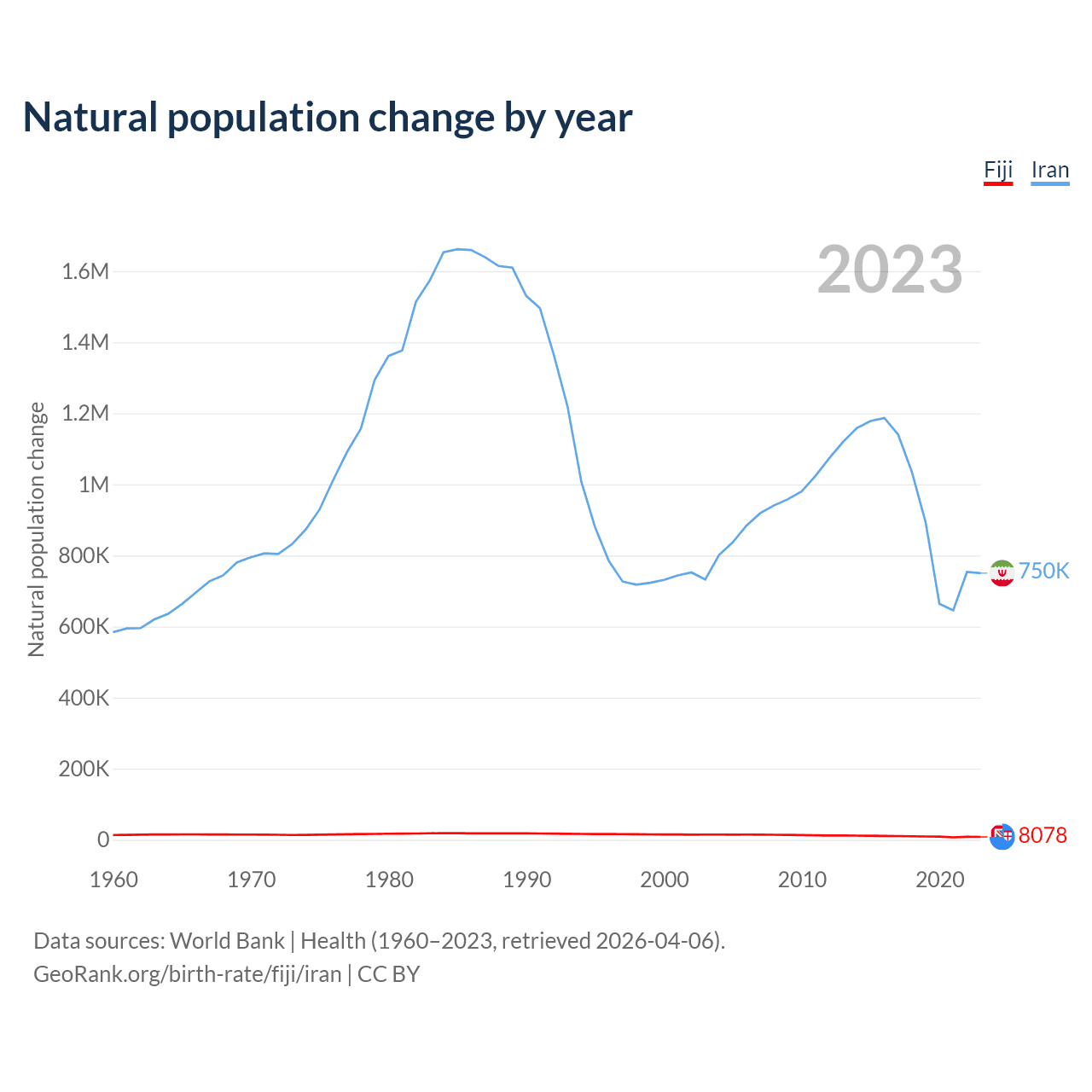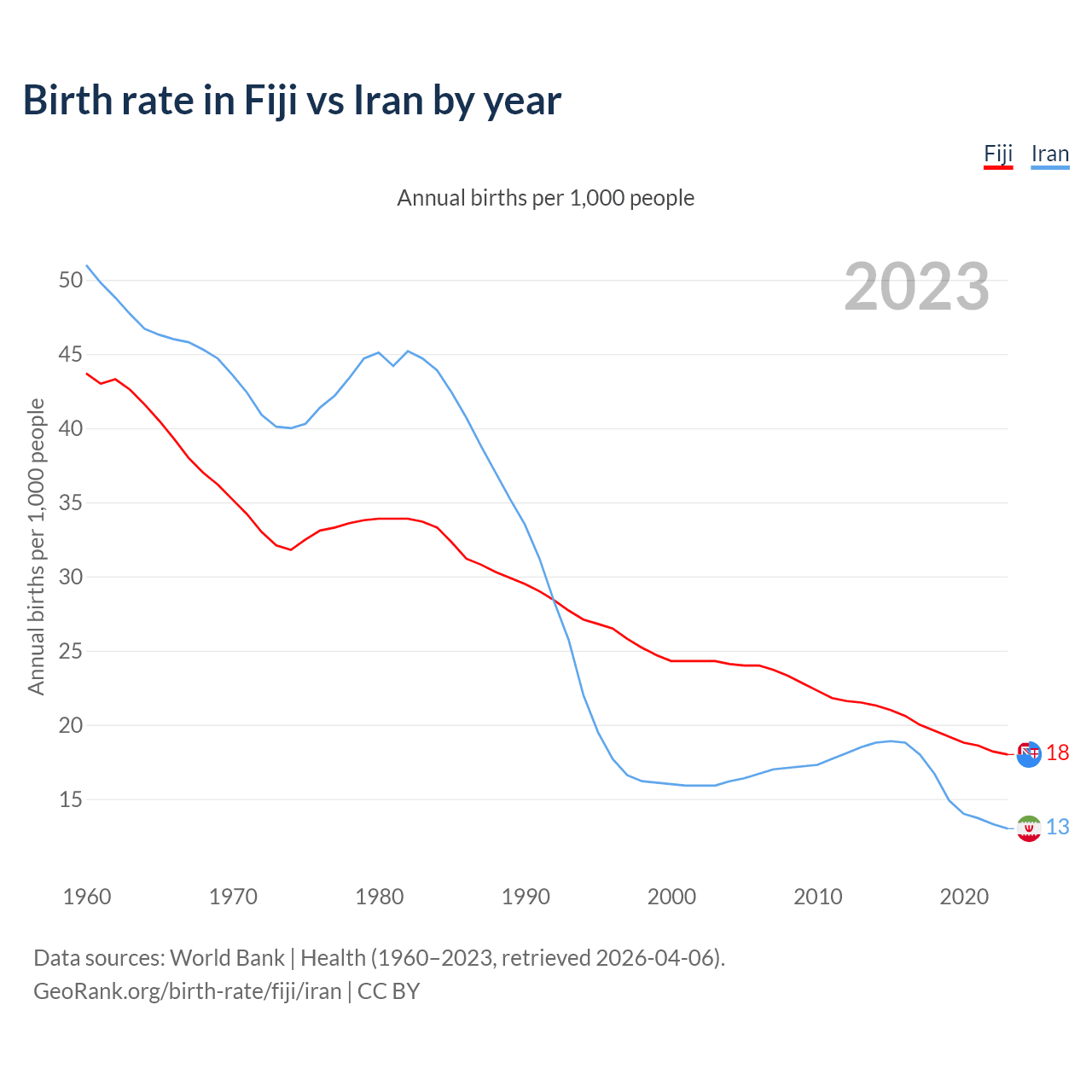 Fiji has an annual birth rate of 18 births per 1,000 people, compared to 13 for Iran. The average number of children a woman is expected to have during her lifetime — the fertility rate, is 2.28 in Fiji and 1.7 in Iran — 25.7% difference.