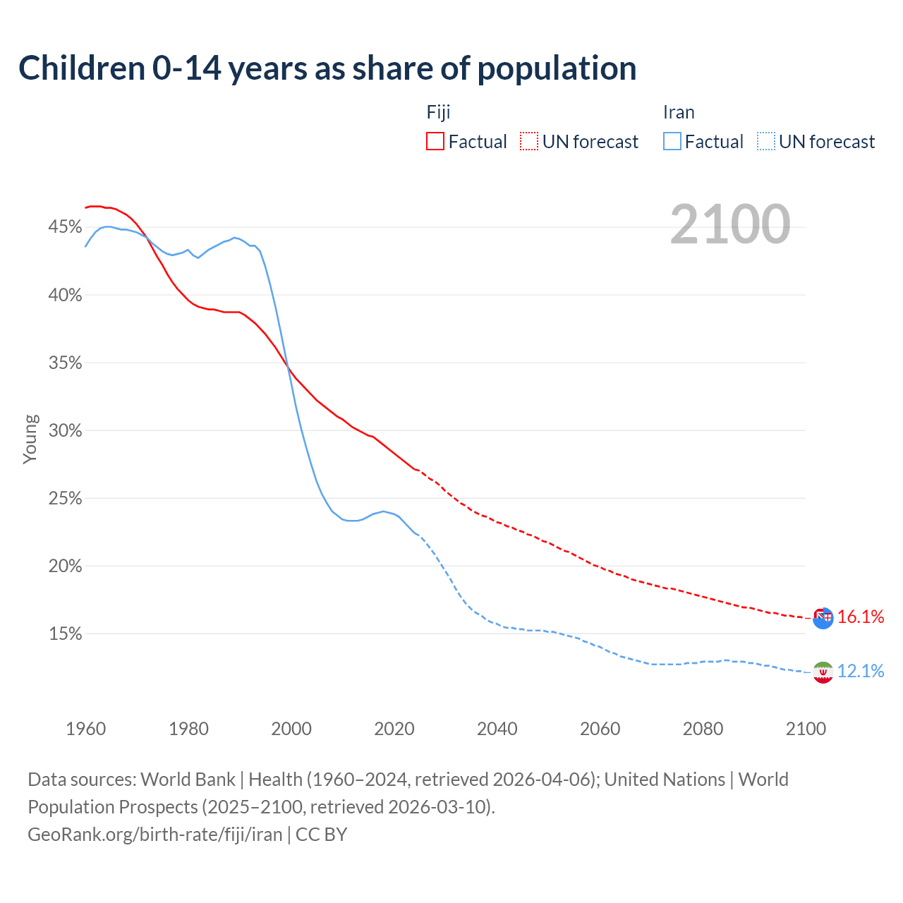 According to the latest available data on birth rates, the fertility rate in Fiji was 2.28 children per woman in 2023, compared to 1.7 in Iran in 2023. The replacement level is considered to be 2.1 children per woman.