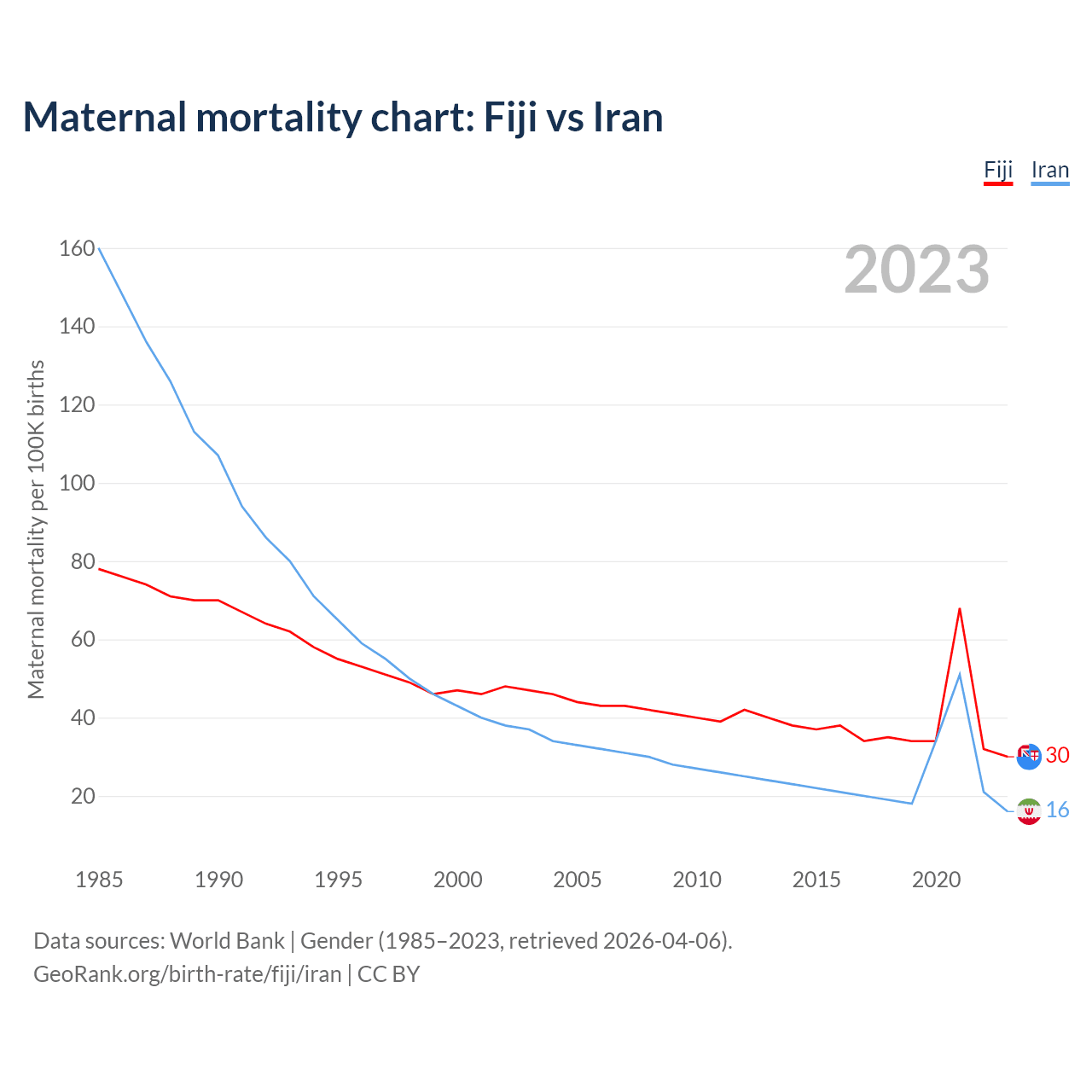 The maternal mortality rate, which is the probability of dying during childbirth or within 42 days of pregnancy termination, is 30 deaths per 100,000 live births in Fiji, compared to 16 deaths in Iran.