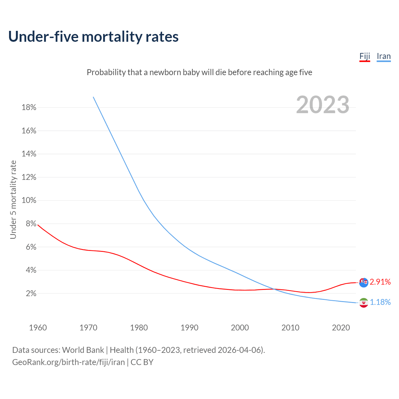 The chance that a newborn baby will die before reaching age five is 2.91% in Fiji and 1.18% in Iran. Above is a chart with historical data on under-five mortality rates.