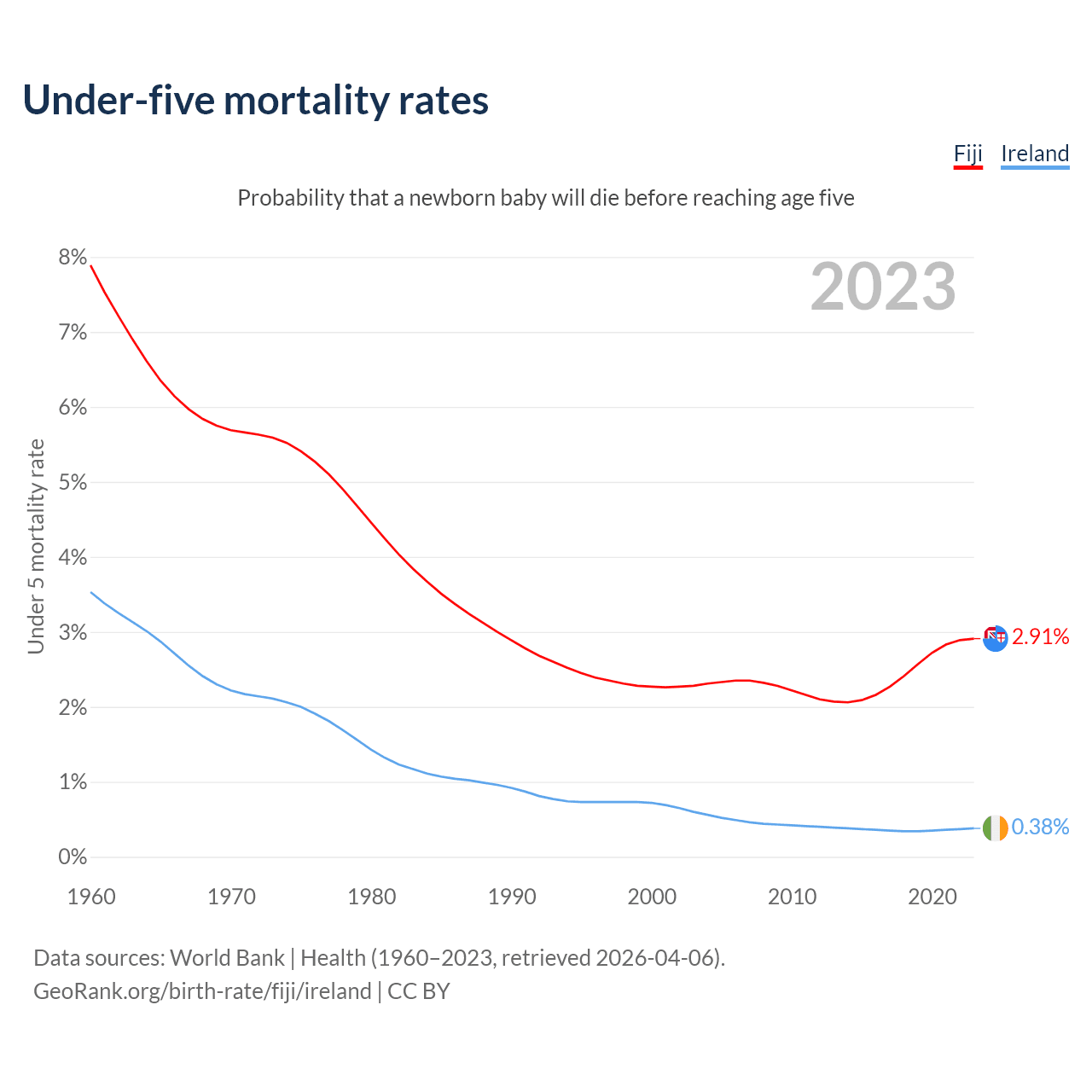 The chance that a newborn baby will die before reaching age five is 2.91% in Fiji and 0.38% in Ireland. Above is a chart with historical data on under-five mortality rates.