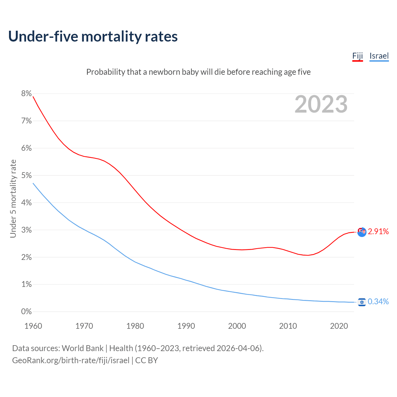The chance that a newborn baby will die before reaching age five is 2.91% in Fiji and 0.34% in Israel. Above is a chart with historical data on under-five mortality rates.