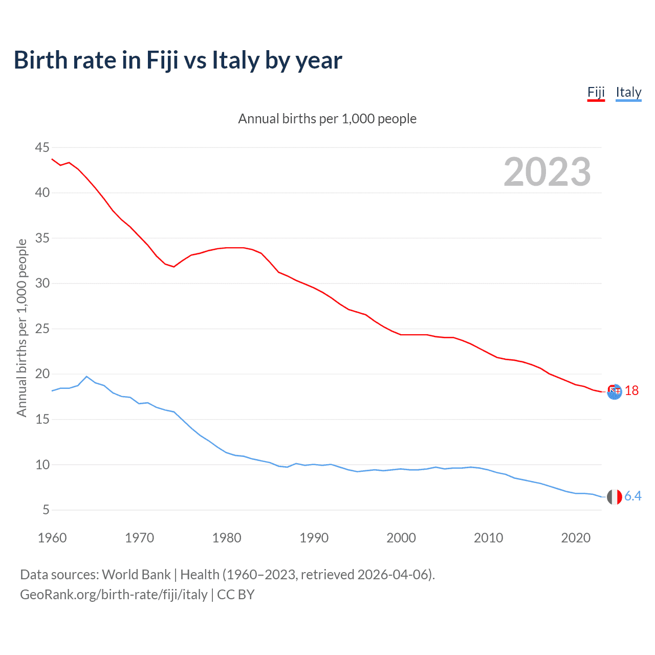 Fiji has an annual birth rate of 18 births per 1,000 people, compared to 6.4 for Italy. The average number of children a woman is expected to have during her lifetime — the fertility rate, is 2.28 in Fiji and 1.2 in Italy — 47.4% difference.