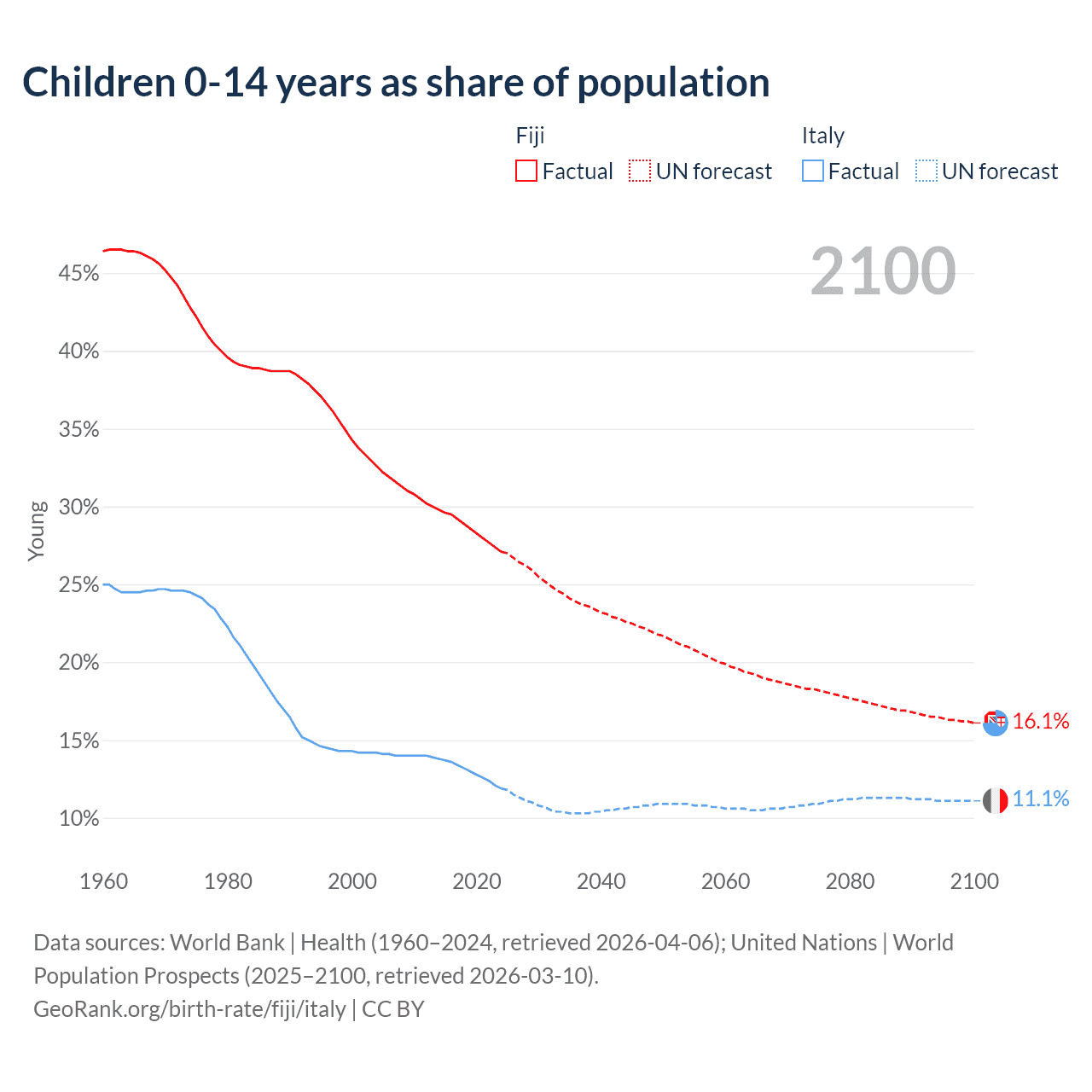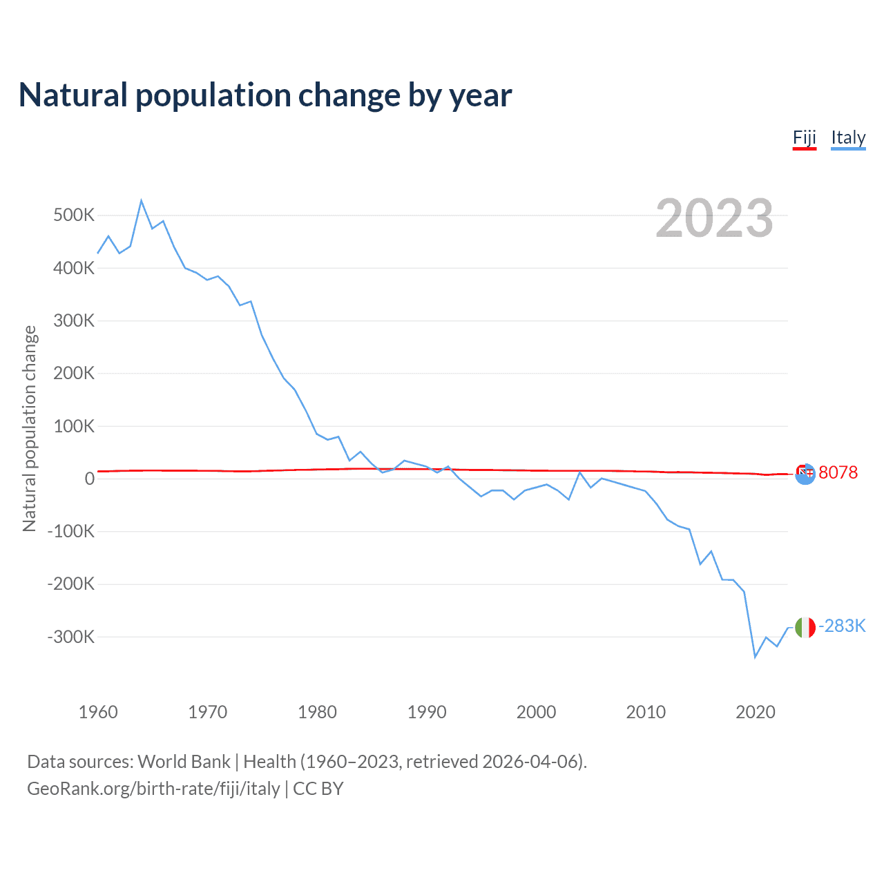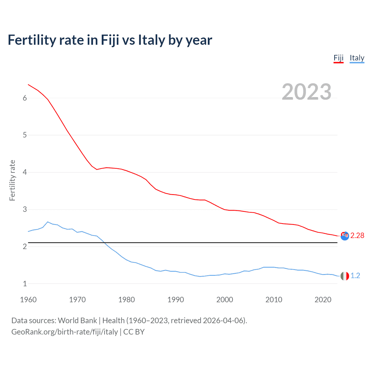 According to the latest available data on birth rates, the fertility rate in Fiji was 2.28 children per woman in 2023, compared to 1.2 in Italy in 2023. The replacement level is considered to be 2.1 children per woman.