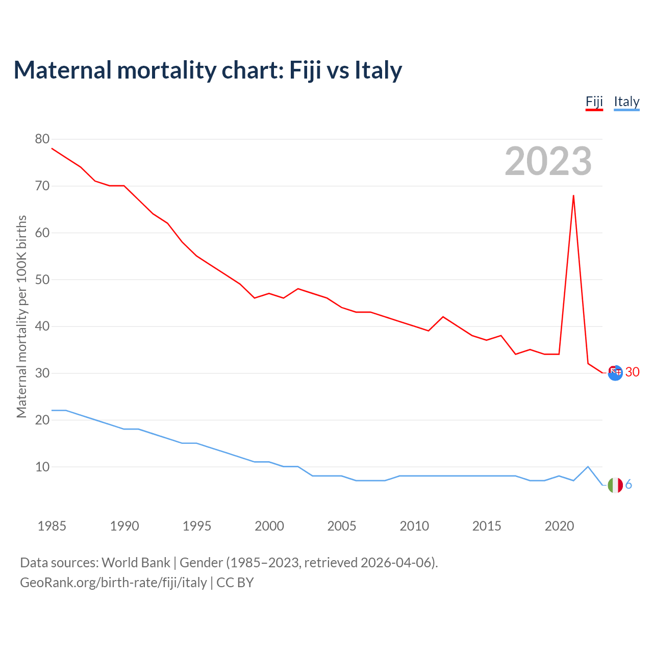 The maternal mortality rate, which is the probability of dying during childbirth or within 42 days of pregnancy termination, is 30 deaths per 100,000 live births in Fiji, compared to 6 deaths in Italy.