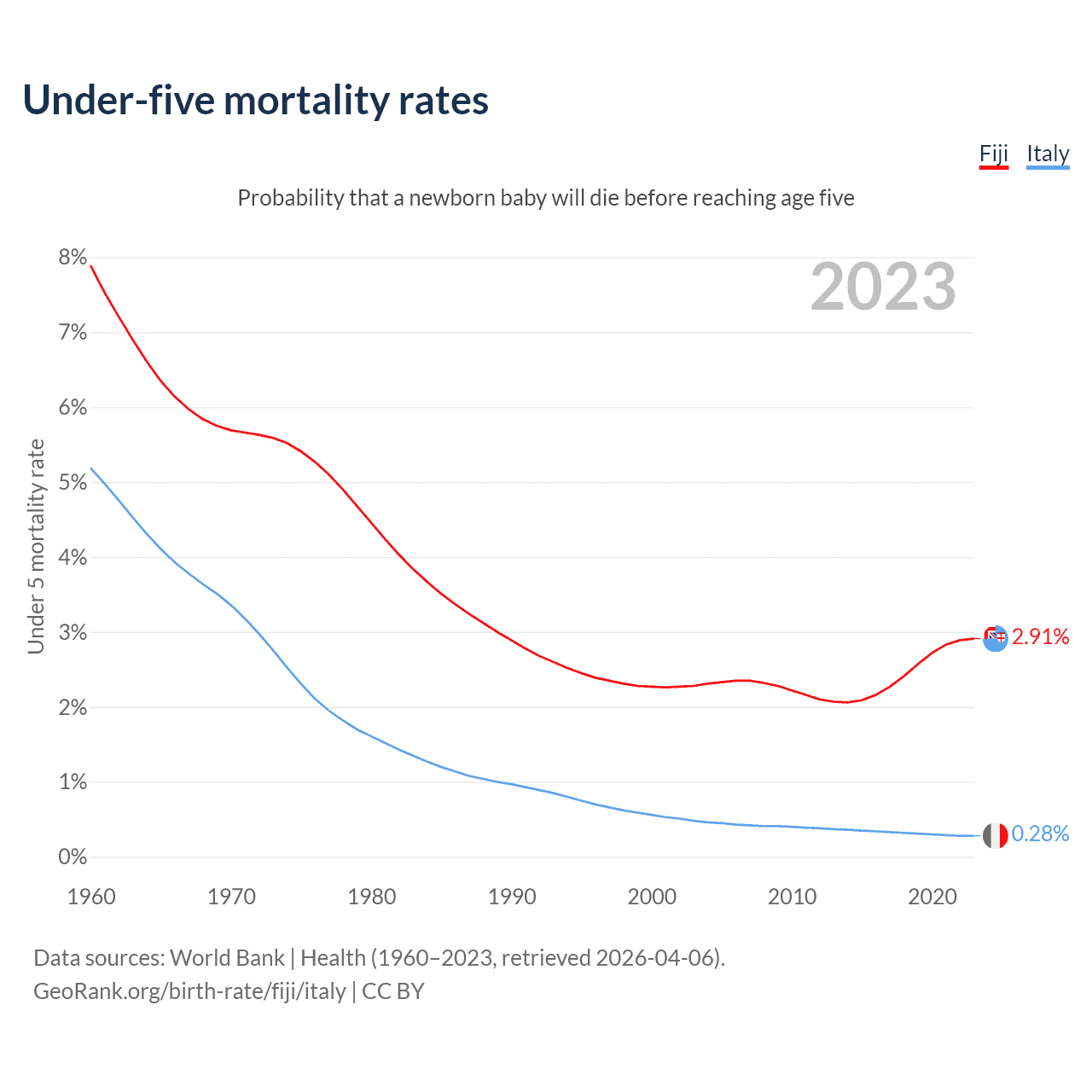 The chance that a newborn baby will die before reaching age five is 2.91% in Fiji and 0.28% in Italy. Above is a chart with historical data on under-five mortality rates.