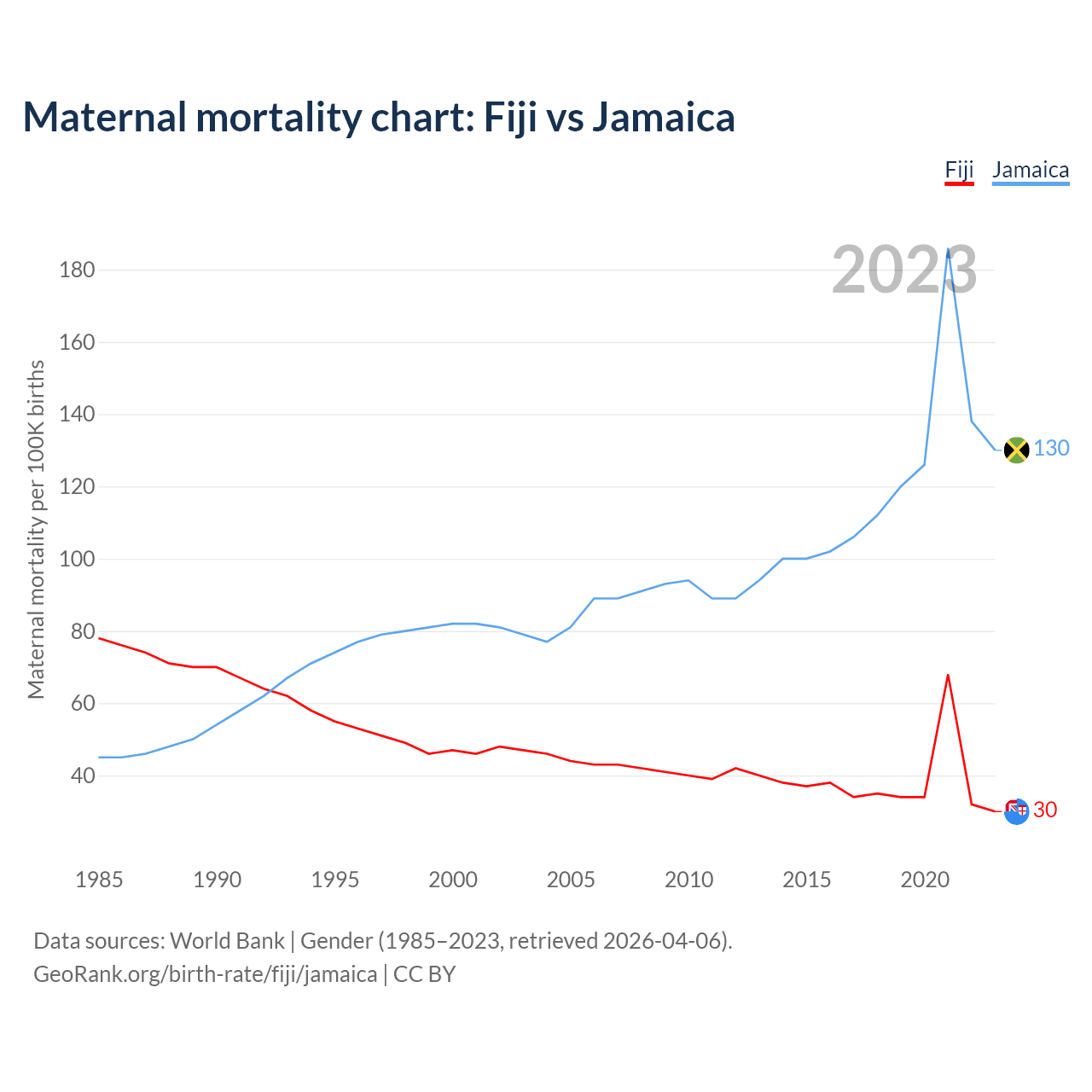 The maternal mortality rate, which is the probability of dying during childbirth or within 42 days of pregnancy termination, is 30 deaths per 100,000 live births in Fiji, compared to 130 deaths in Jamaica.