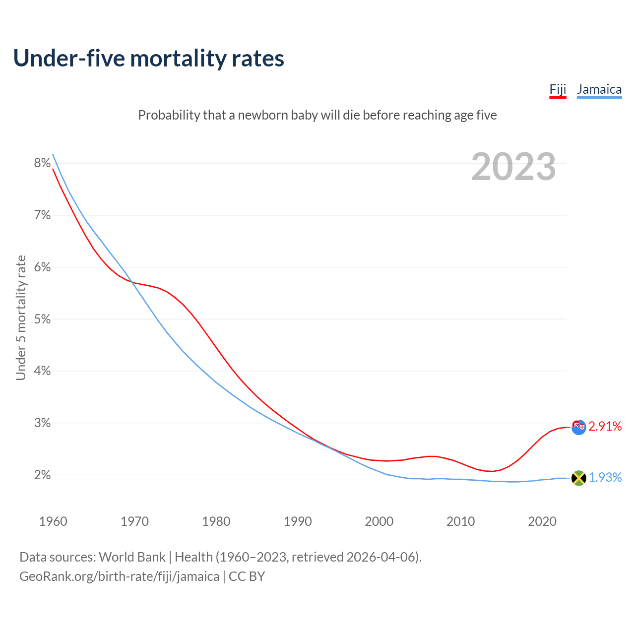 The chance that a newborn baby will die before reaching age five is 2.91% in Fiji and 1.93% in Jamaica. Above is a chart with historical data on under-five mortality rates.