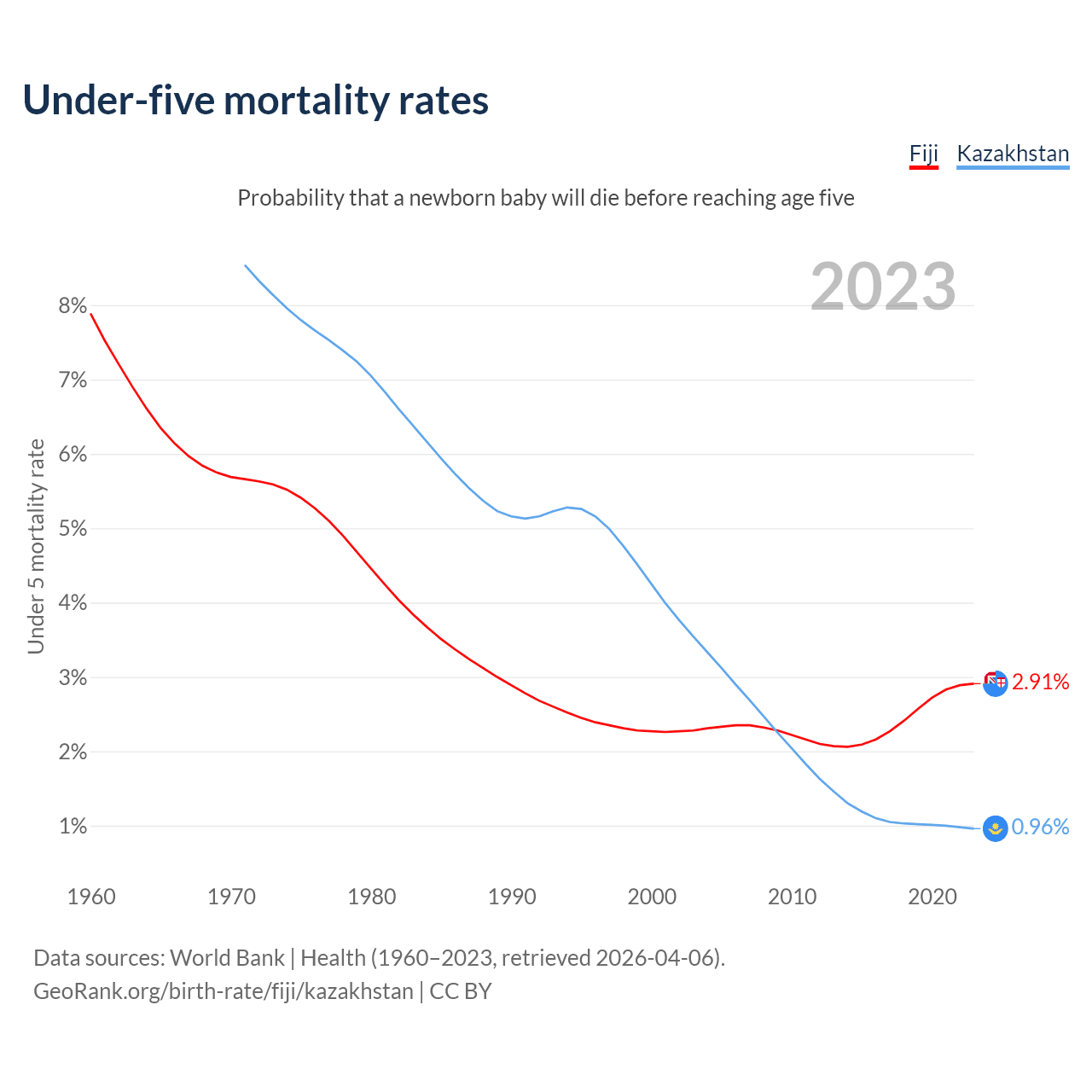 The chance that a newborn baby will die before reaching age five is 2.91% in Fiji and 0.96% in Kazakhstan. Above is a chart with historical data on under-five mortality rates.