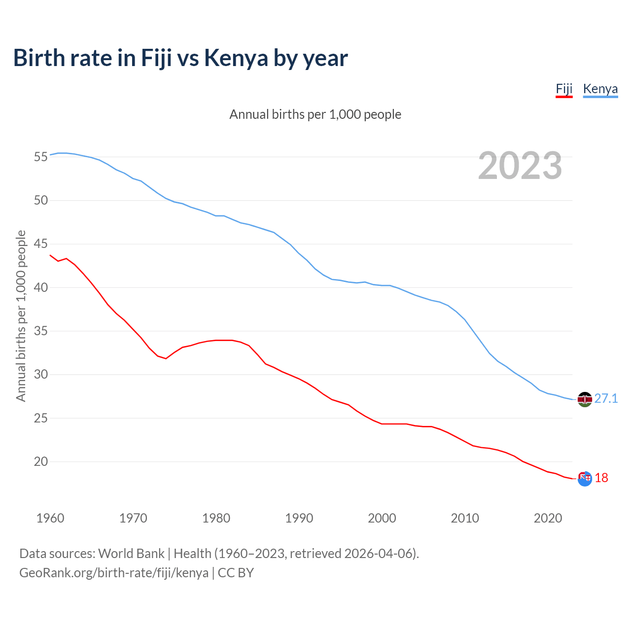 Fiji has an annual birth rate of 18 births per 1,000 people, compared to 27.1 for Kenya. The average number of children a woman is expected to have during her lifetime — the fertility rate, is 2.28 in Fiji and 3.21 in Kenya — 40.6% difference.