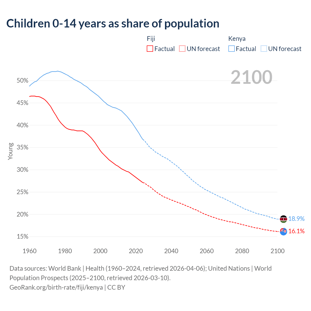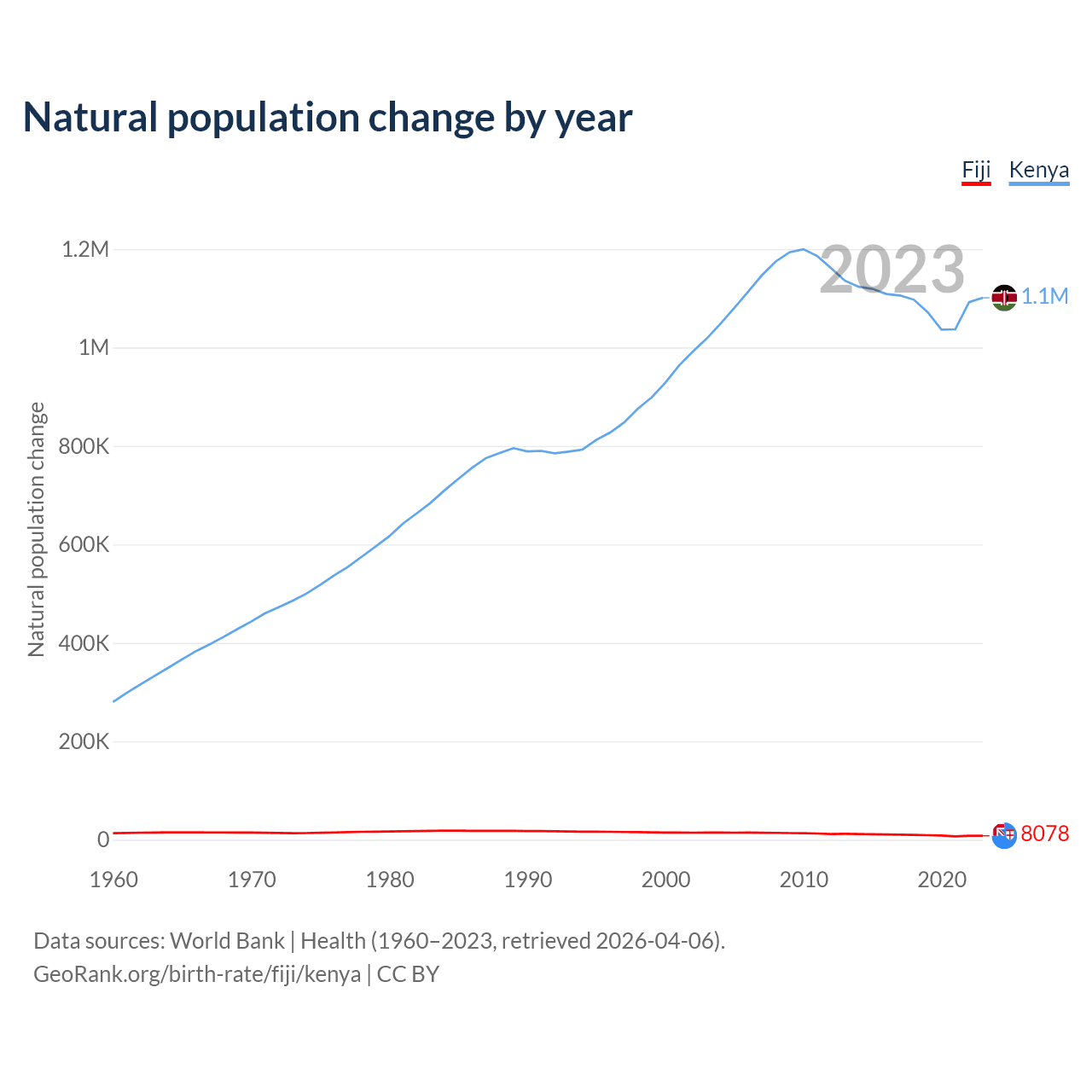 According to the latest available data on birth rates, the fertility rate in Fiji was 2.28 children per woman in 2023, compared to 3.21 in Kenya in 2023. The replacement level is considered to be 2.1 children per woman.