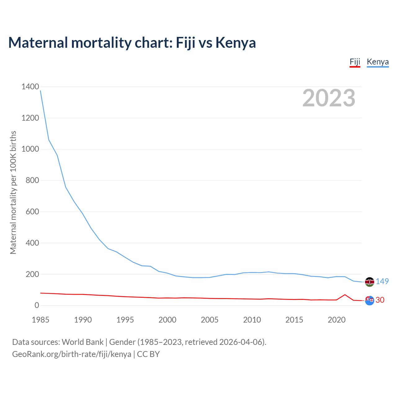 The maternal mortality rate, which is the probability of dying during childbirth or within 42 days of pregnancy termination, is 30 deaths per 100,000 live births in Fiji, compared to 149 deaths in Kenya.