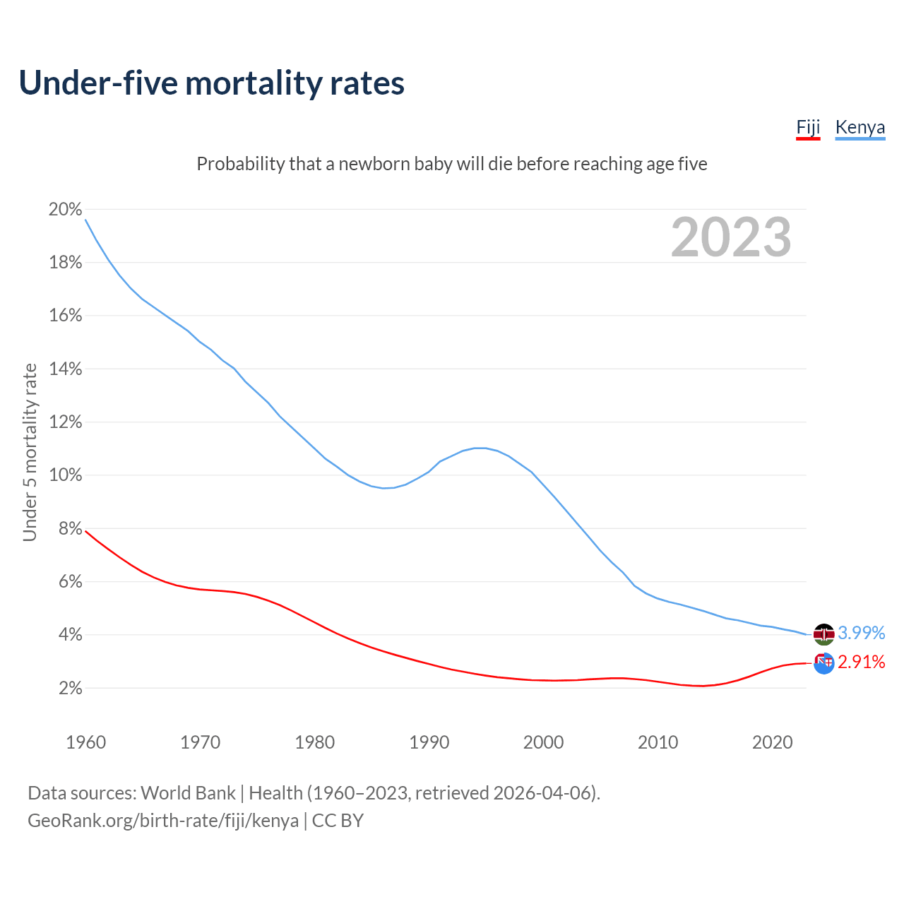 The chance that a newborn baby will die before reaching age five is 2.91% in Fiji and 3.99% in Kenya. Above is a chart with historical data on under-five mortality rates.