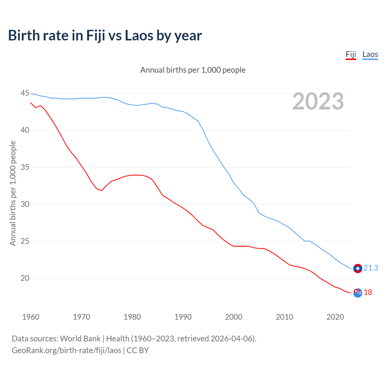 Fiji has an annual birth rate of 18 births per 1,000 people, compared to 21.3 for Laos. The average number of children a woman is expected to have during her lifetime — the fertility rate, is 2.28 in Fiji and 2.42 in Laos — 6.14% difference.