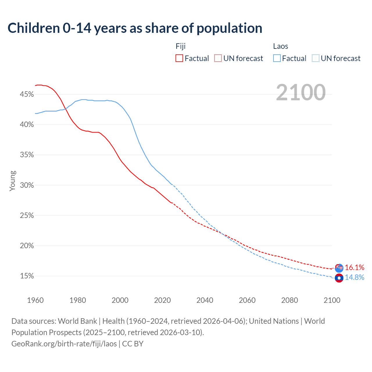 According to the latest available data on birth rates, the fertility rate in Fiji was 2.28 children per woman in 2023, compared to 2.42 in Laos in 2023. The replacement level is considered to be 2.1 children per woman.