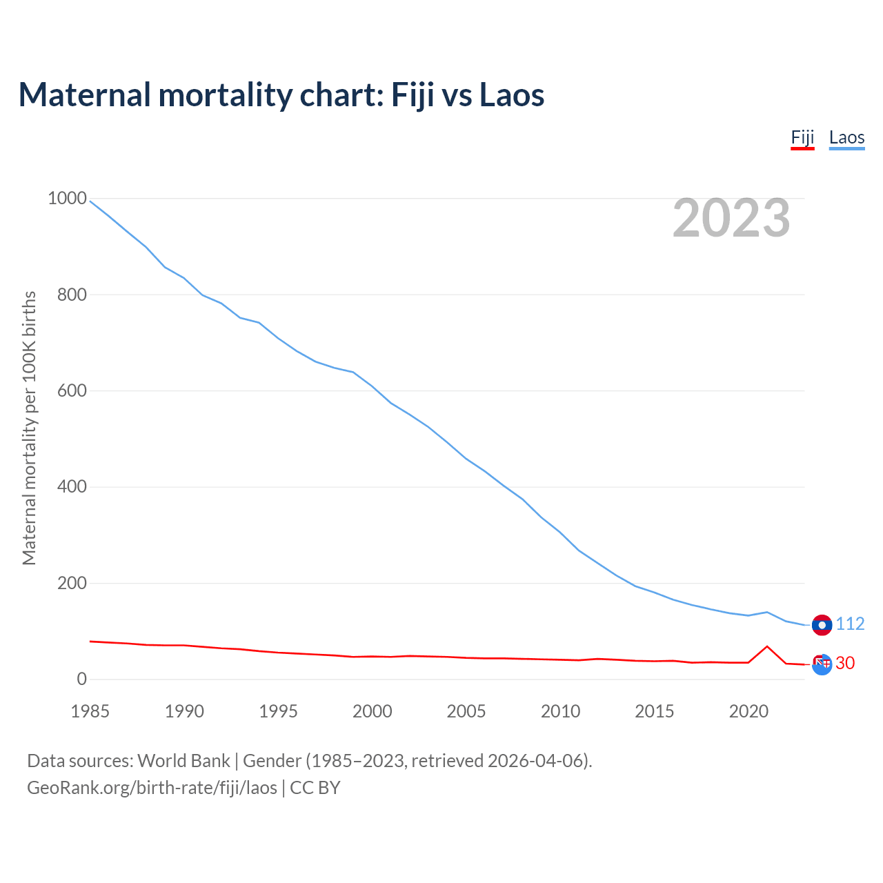 The maternal mortality rate, which is the probability of dying during childbirth or within 42 days of pregnancy termination, is 30 deaths per 100,000 live births in Fiji, compared to 112 deaths in Laos.