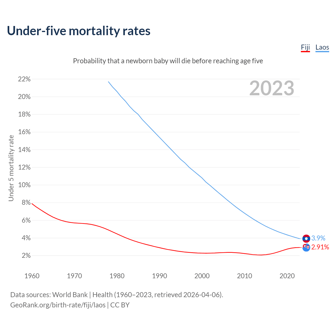 The chance that a newborn baby will die before reaching age five is 2.91% in Fiji and 3.9% in Laos. Above is a chart with historical data on under-five mortality rates.