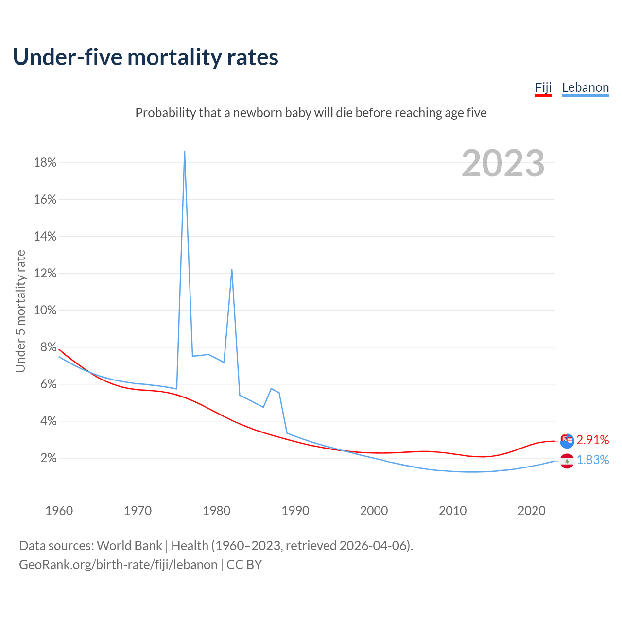 The chance that a newborn baby will die before reaching age five is 2.91% in Fiji and 1.83% in Lebanon. Above is a chart with historical data on under-five mortality rates.