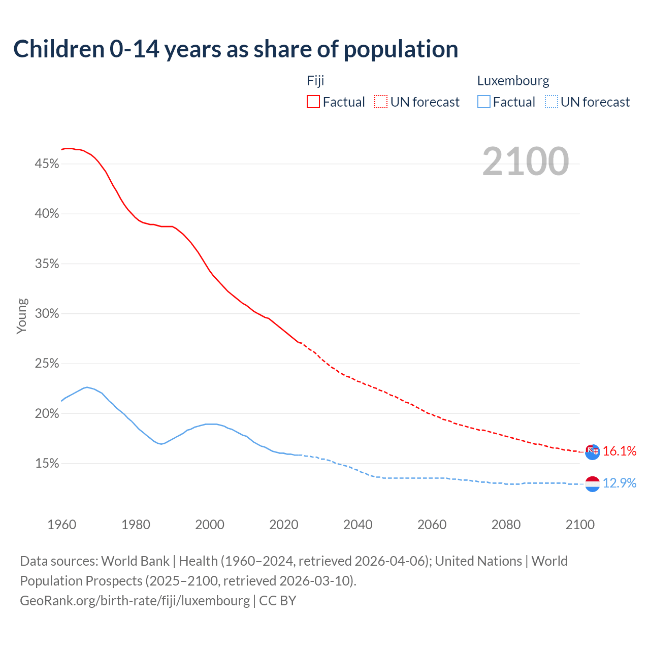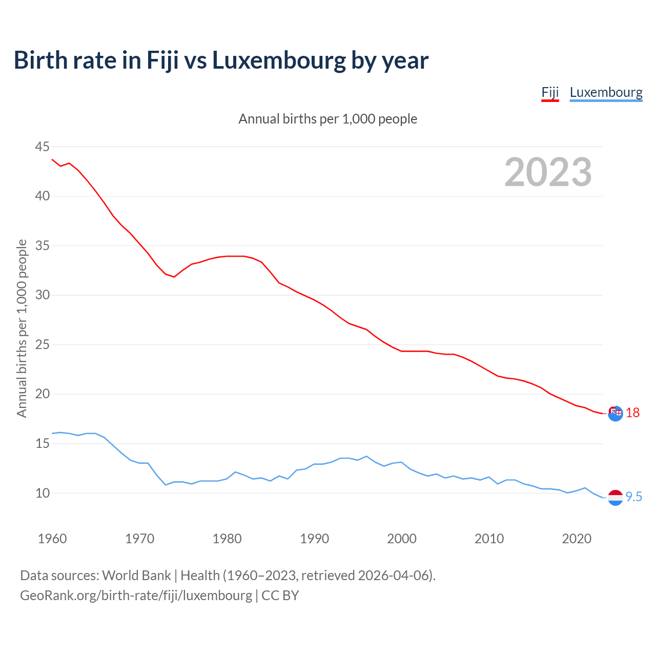 According to the latest available data on birth rates, the fertility rate in Fiji was 2.28 children per woman in 2023, compared to 1.25 in Luxembourg in 2023. The replacement level is considered to be 2.1 children per woman.