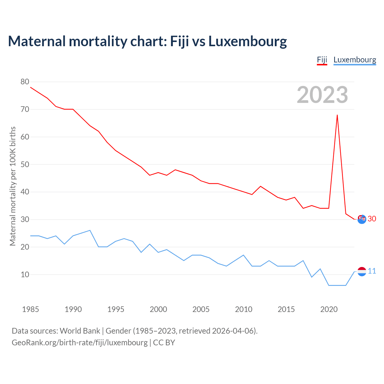 The maternal mortality rate, which is the probability of dying during childbirth or within 42 days of pregnancy termination, is 30 deaths per 100,000 live births in Fiji, compared to 11 deaths in Luxembourg.
