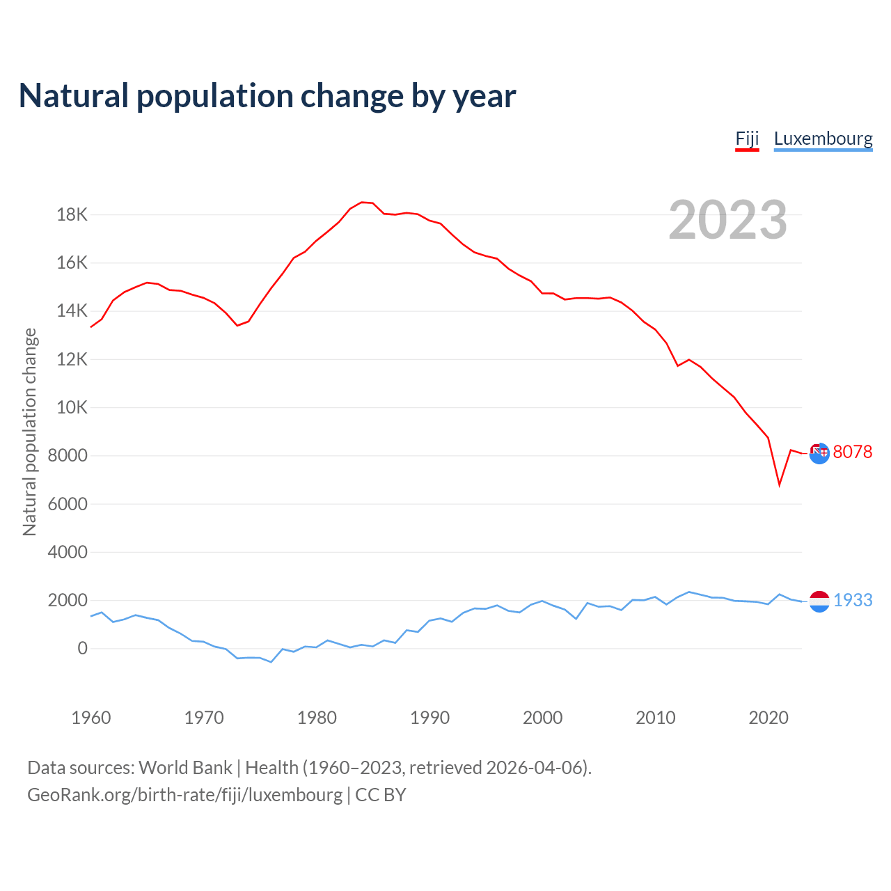 Fiji has an annual birth rate of 18 births per 1,000 people, compared to 9.5 for Luxembourg. The average number of children a woman is expected to have during her lifetime — the fertility rate, is 2.28 in Fiji and 1.25 in Luxembourg — 45.2% difference.
