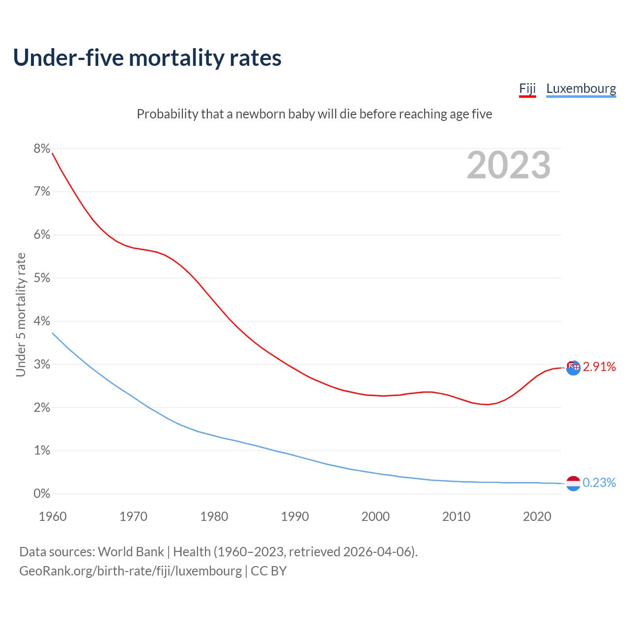 The chance that a newborn baby will die before reaching age five is 2.91% in Fiji and 0.23% in Luxembourg. Above is a chart with historical data on under-five mortality rates.