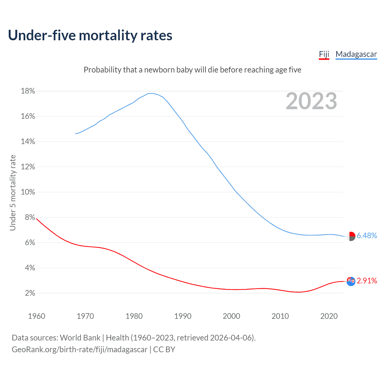 The chance that a newborn baby will die before reaching age five is 2.91% in Fiji and 6.48% in Madagascar. Above is a chart with historical data on under-five mortality rates.