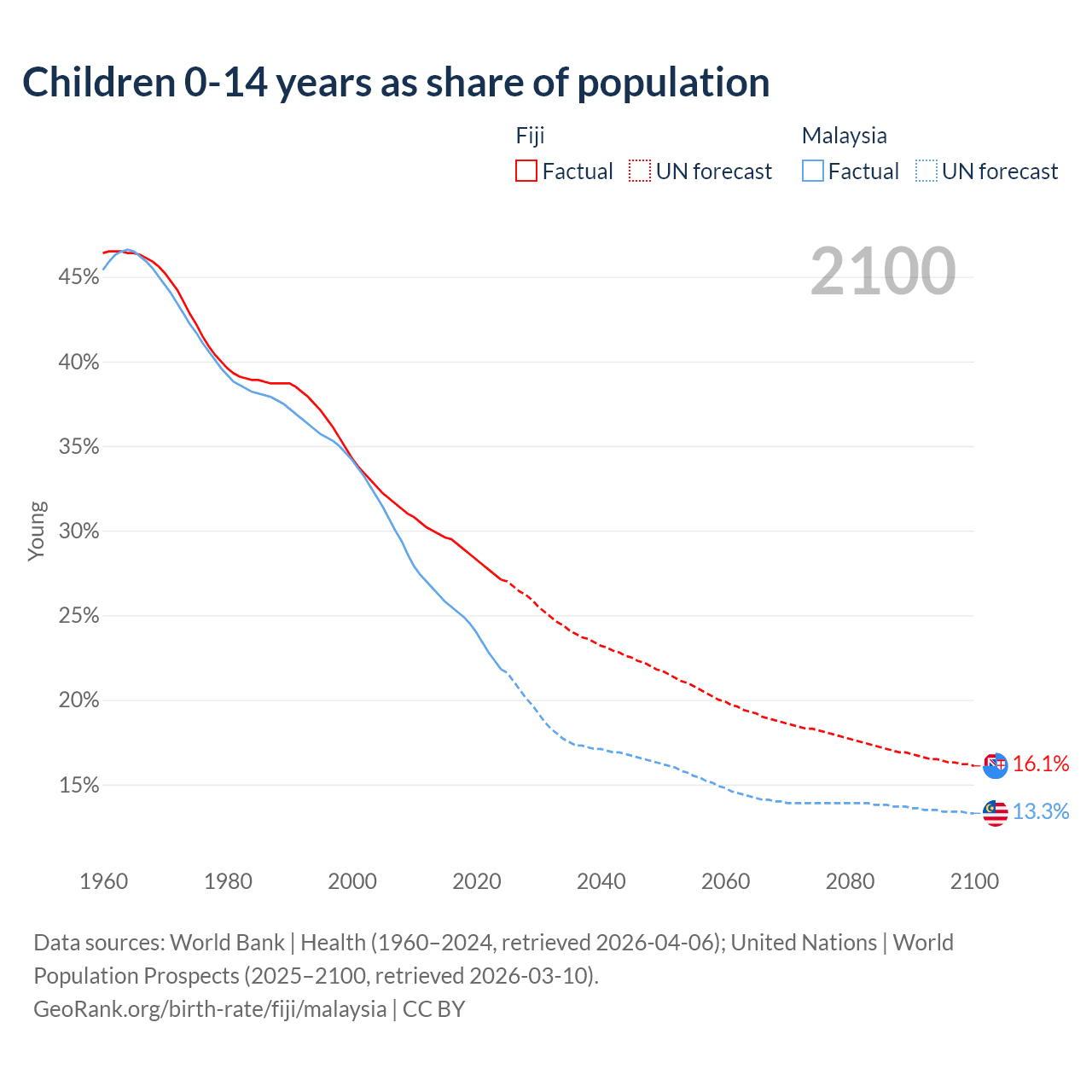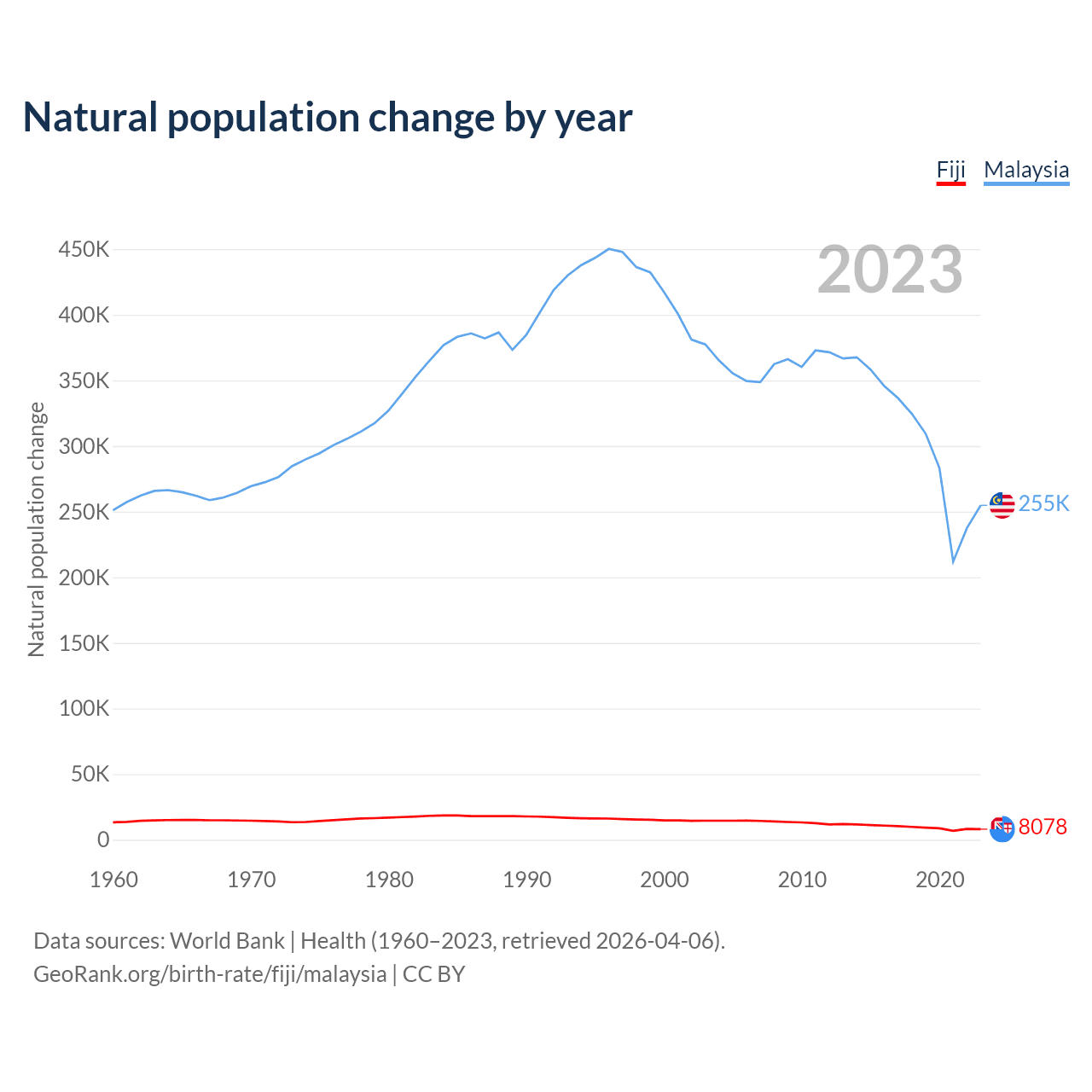 According to the latest available data on birth rates, the fertility rate in Fiji was 2.28 children per woman in 2023, compared to 1.55 in Malaysia in 2023. The replacement level is considered to be 2.1 children per woman.