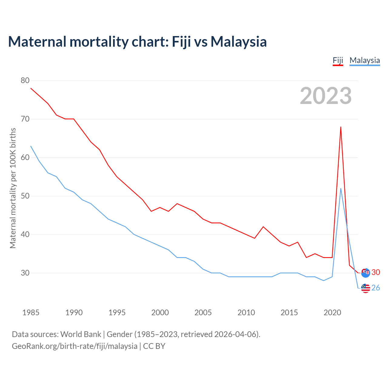 The maternal mortality rate, which is the probability of dying during childbirth or within 42 days of pregnancy termination, is 30 deaths per 100,000 live births in Fiji, compared to 26 deaths in Malaysia.