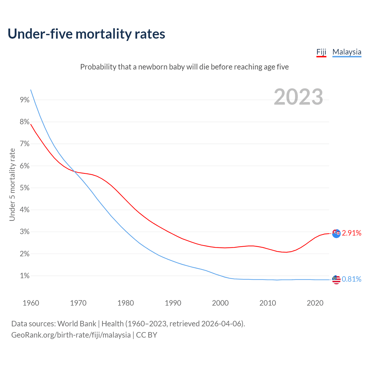 The chance that a newborn baby will die before reaching age five is 2.91% in Fiji and 0.81% in Malaysia. Above is a chart with historical data on under-five mortality rates.